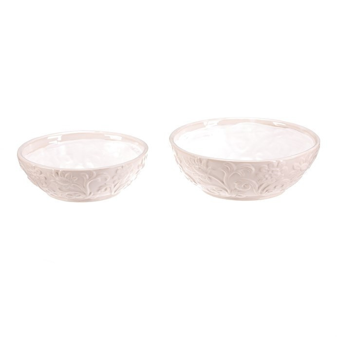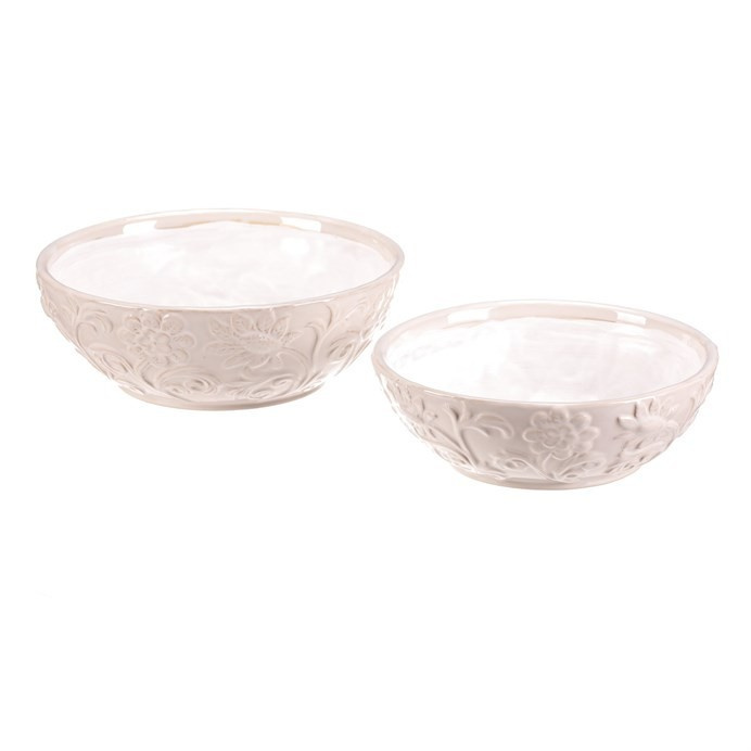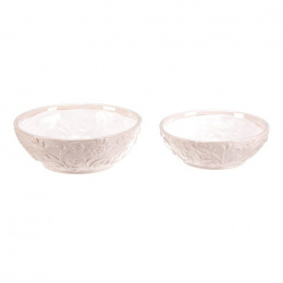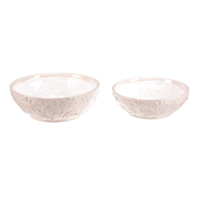 Sada dvou keramických misek v krémovém odstínu zaujme jemným květinovým dekorem po celém obvodu. Misky mají hladký lesklý povrch a zaoblený tvar, který je vhodný pro různé dekorativní i praktické využití v interiéru. Keramický materiál je navržen pro dlouhou životnost a snadnou údržbu. Díky univerzálním rozměrům lze misky využít samostatně nebo jako elegantní doplněk k aranžování květin či jiných dekorací.