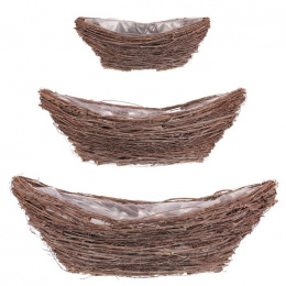Sada tří proutěných obalů ve tvaru loďky v přírodním odstínu nabízí univerzální využití pro aranžmá květin či dekorací. Každý obal je vyroben z pevného proutí a je opatřen vnitřní igelitovou vložkou, která chrání před prosakováním vody. Přírodní textura a tvar loďky přinášejí do interiéru i exteriéru příjemný rustikální efekt. Obaly jsou vhodné pro použití na parapetech, terasách nebo jako součást dekorativních sestav. Díky různým velikostem v sadě je možné je kombinovat podle potřeby.