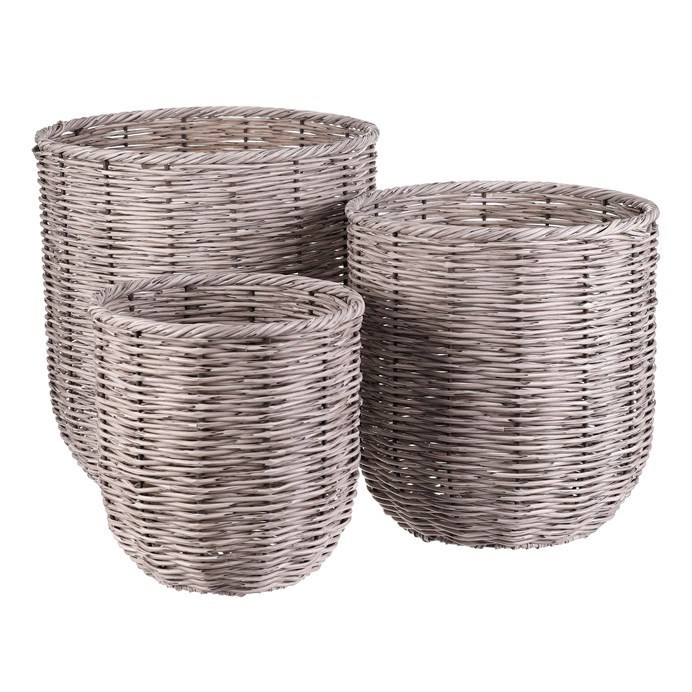 Sada tří obalů na květináče je vyrobena z umělého ratanu v šedém odstínu, který věrně napodobuje přírodní materiál a zároveň je odolný vůči povětrnostním vlivům. Každý obal má pevnou kovovou konstrukci, která zajišťuje stabilitu a dlouhou životnost. Kulatý tvar a husté proplétání polyratanu vytváří příjemný vizuální efekt vhodný do moderních i klasických interiérů. Obaly jsou vhodné pro různé velikosti květináčů a lze je využít jak v interiéru, tak na terase či balkóně. Díky sadě tří kusů je možné vytvořit stylovou a jednotnou dekoraci s praktickým využitím.