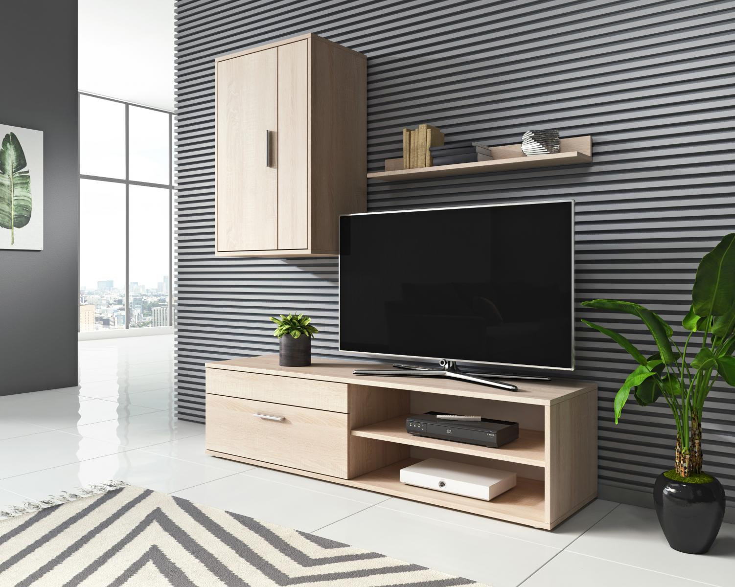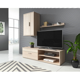 Obývací stěna Togo 2 je vyrobena z lamina, které je odolné proti poškrábání a je velmi snadné na údržbu. Díky svým rozměrům je vhodná i pro ty, kteří obývají malometrážní byty a garsonky. Televizní stolek má v levé části výklopná dvířka, v pravé části je police. Závěsná skříňka je uvnitř vybavena policí. Cena je uvedena za komplet vyobrazený na fotografii, bez doplňků a dekorací. Obývací stěna Togo je dodávaná v demontu. Součástí balení je montážní návoz včetně všech potřebných spojovacích prvků. Stěnu nabízíme ve třech dekorech.