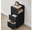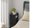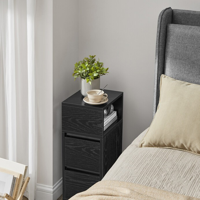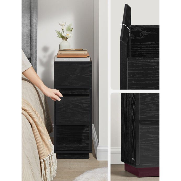 Noční stolek o rozměrech 25x30x65 cm je vyroben z MDF s matnou povrchovou úpravou v černém dekoru dřeva, která zajišťuje snadnou údržbu a odolnost proti běžnému opotřebení. Jeho kompaktní tvar nabízí praktický úložný prostor v otevřené přihrádce i za dvířky, což umožňuje efektivní organizaci drobných předmětů. Stolek má minimalistický design s čistými liniemi a decentními úchytkami, které podtrhují jeho moderní vzhled. Díky pevné konstrukci a stabilní základně je vhodný pro použití v ložnici i dalších interiérech, kde je potřeba praktický a nenáročný doplněk.