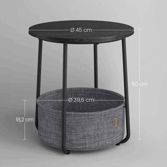 Kulatý odkládací stolek o průměru 45 cm a výšce 50 cm nabízí praktický prostor pro odložení drobností díky textilnímu koši umístěnému pod deskou. Deska je vyrobena z MDF s černým dekorem, který doplňuje černé kovové nohy s jemně zaoblenými tvary, jež zajišťují stabilitu a moderní vzhled. Textilní koš je pevný a snadno přístupný, ideální pro uložení časopisů, dek nebo jiných předmětů. Kompaktní rozměry stolku umožňují jeho využití v obývacím pokoji, ložnici či pracovně jako praktický doplněk s úložným potenciálem.
