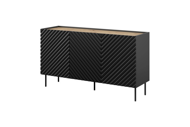 komoda 150 ( 3D2SZ ) rozměry: V./šířka./ dg.85cm/150cm/45cm Materiál: tělo: černá 16 mm laminovaná deska čela: černá 18 mm MDF frézovaná deska + černá podložka PVC fólie horní deska: 16 mm řemeslně laminovaná deska zadní deska: černá 3 mm HDF deska panty: tiché zavírání nožičky: ocelové černé výška: 2,5 mm 200 mm, průměr úchytů 20 mm: čela vyčnívají nad horní panel