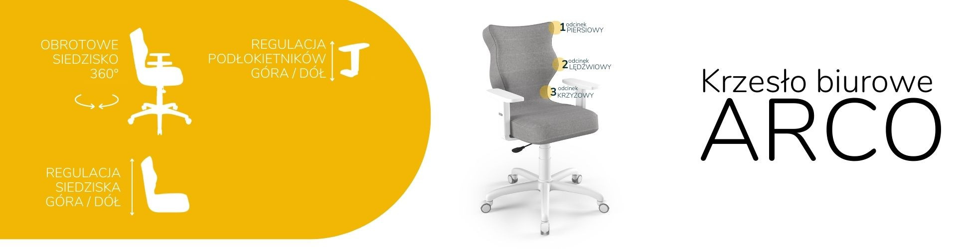 Židle Arco je ergonomická kancelářská židle, která byla navržena pro lidi pracující vsedě. Čalouněná kancelářská židle Arco je vybavena měkkým a pohodlným sedákem, který poskytuje dostatečné pohodlí osobám sedícím u stolu po mnoho hodin. Kancelářská židle Arco je navíc vybavena speciálně tvarovaným opěradlem, které zmírňuje namáhání páteře. Konstrukce a tvar opěradla jsou profilovány tak, aby nedocházelo k přetěžování páteře a aby se zabránilo vadám držení těla, jako je skolióza. Profilovaná kancelářská židle poskytuje nejen stabilní oporu zádům sedícího, ale také ovlivňuje správnou polohu zad. Měkké plastové sedadlo netlačí na nohy a je pohodlné i při několikahodinové práci v jedné poloze.