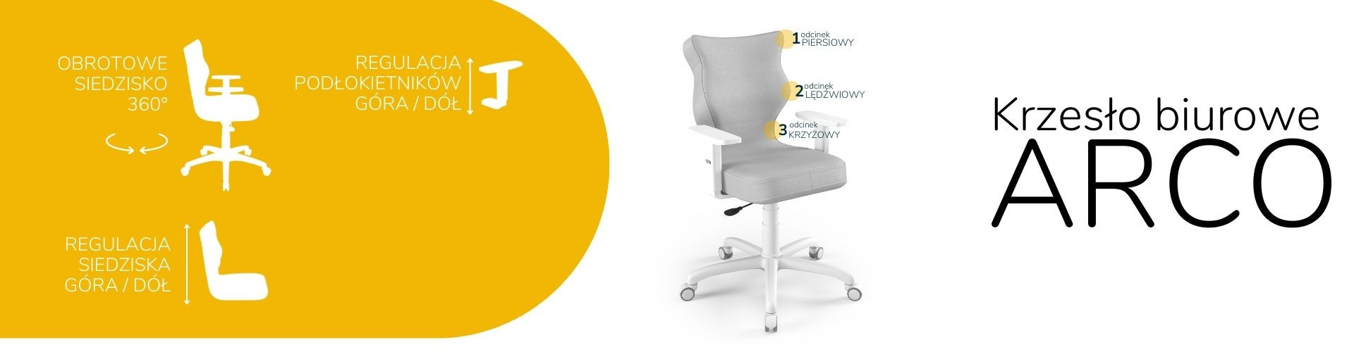 Židle Arco je ergonomická kancelářská židle, která byla navržena pro lidi pracující vsedě. Čalouněná kancelářská židle Arco je vybavena měkkým a pohodlným sedákem, který poskytuje dostatečné pohodlí osobám sedícím u stolu po mnoho hodin. Kancelářská židle Arco je navíc vybavena speciálně tvarovaným opěradlem, které zmírňuje namáhání páteře. Konstrukce a tvar opěradla jsou profilovány tak, aby nedocházelo k přetěžování páteře a aby se zabránilo vadám držení těla, jako je skolióza. Profilovaná kancelářská židle poskytuje nejen stabilní oporu zádům sedícího, ale také ovlivňuje správnou polohu zad. Měkké plastové sedadlo netlačí na nohy a je pohodlné i při několikahodinové práci v jedné poloze.