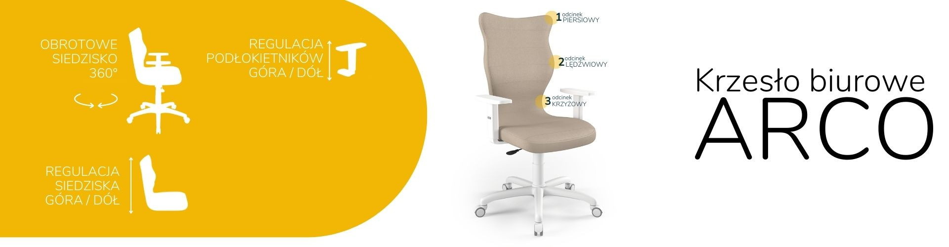 Židle Arco je ergonomická kancelářská židle, která byla navržena pro lidi pracující vsedě. Čalouněná kancelářská židle Arco je vybavena měkkým a pohodlným sedákem, který poskytuje dostatečné pohodlí osobám sedícím u stolu po mnoho hodin. Kancelářská židle Arco je navíc vybavena speciálně tvarovaným opěradlem, které zmírňuje namáhání páteře. Konstrukce a tvar opěradla jsou profilovány tak, aby nedocházelo k přetěžování páteře a aby se zabránilo vadám držení těla, jako je skolióza. Profilovaná kancelářská židle poskytuje nejen stabilní oporu zádům sedícího, ale také ovlivňuje správnou polohu zad. Měkké plastové sedadlo netlačí na nohy a je pohodlné i při několikahodinové práci v jedné poloze.