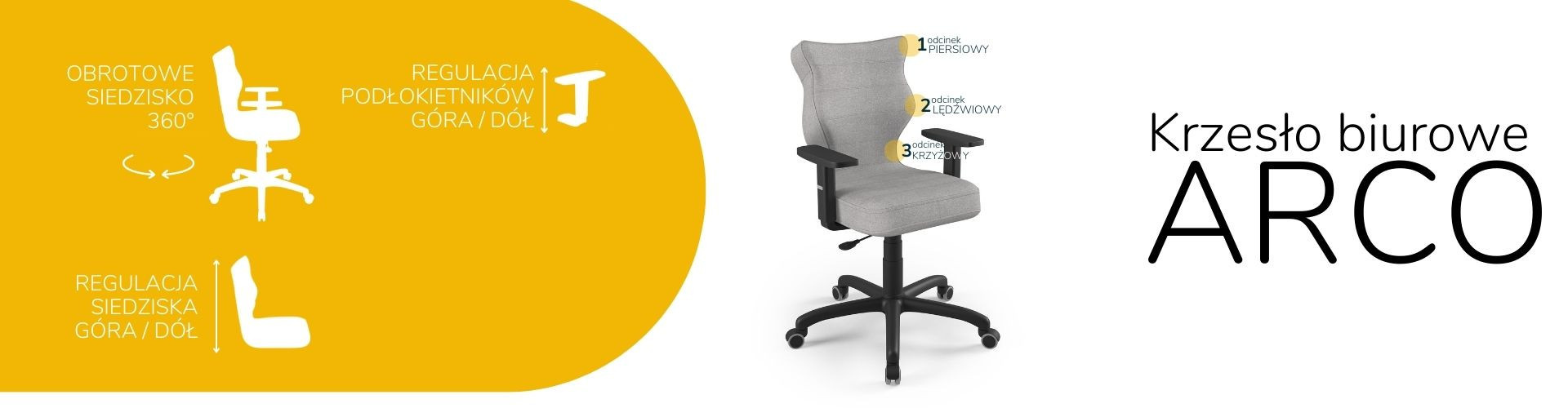 Židle Arco je ergonomická kancelářská židle, která byla navržena pro lidi pracující vsedě. Čalouněná kancelářská židle Arco je vybavena měkkým a pohodlným sedákem, který poskytuje dostatečné pohodlí osobám sedícím u stolu po mnoho hodin. Kancelářská židle Arco je navíc vybavena speciálně tvarovaným opěradlem, které zmírňuje namáhání páteře. Konstrukce a tvar opěradla jsou profilovány tak, aby nedocházelo k přetěžování páteře a aby se zabránilo vadám držení těla, jako je skolióza. Profilovaná kancelářská židle poskytuje nejen stabilní oporu zádům sedícího, ale také ovlivňuje správnou polohu zad. Měkké plastové sedadlo netlačí na nohy a je pohodlné i při několikahodinové práci v jedné poloze.