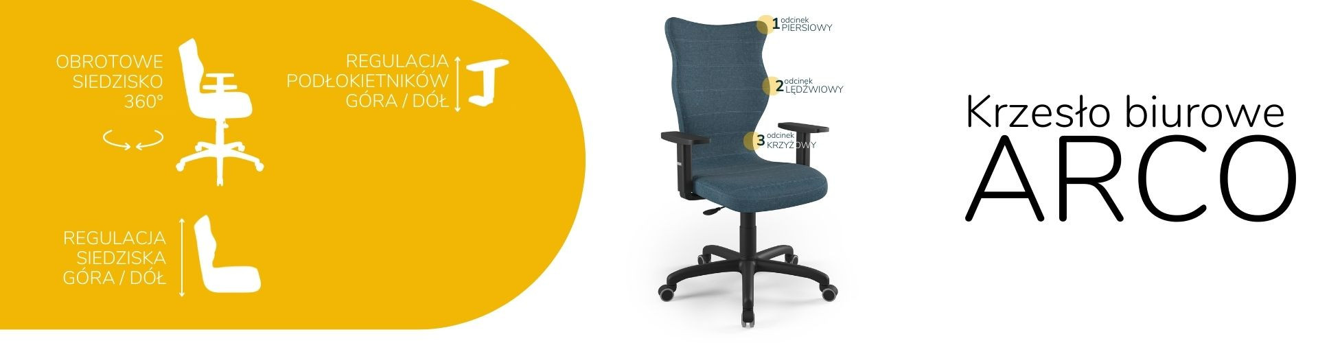 Židle Arco je ergonomická kancelářská židle navržená pro lidi, kteří pracují vsedě. Čalouněná kancelářská židle Arco je vybavena měkkým a pohodlným sedákem, který poskytuje dostatečné pohodlí osobám sedícím u stolu po mnoho hodin. Kancelářská židle Arco je navíc vybavena speciálně tvarovaným opěradlem, které zmírňuje namáhání páteře. Konstrukce a tvar opěradla jsou profilovány tak, aby nedocházelo k přetěžování páteře a aby se zabránilo vadám držení těla, jako je skolióza. Profilovaná kancelářská židle poskytuje nejen stabilní oporu zádům sedícího, ale také ovlivňuje správnou polohu zad. Měkké plastové sedadlo netlačí na nohy a je pohodlné i při několikahodinové práci v jedné poloze.