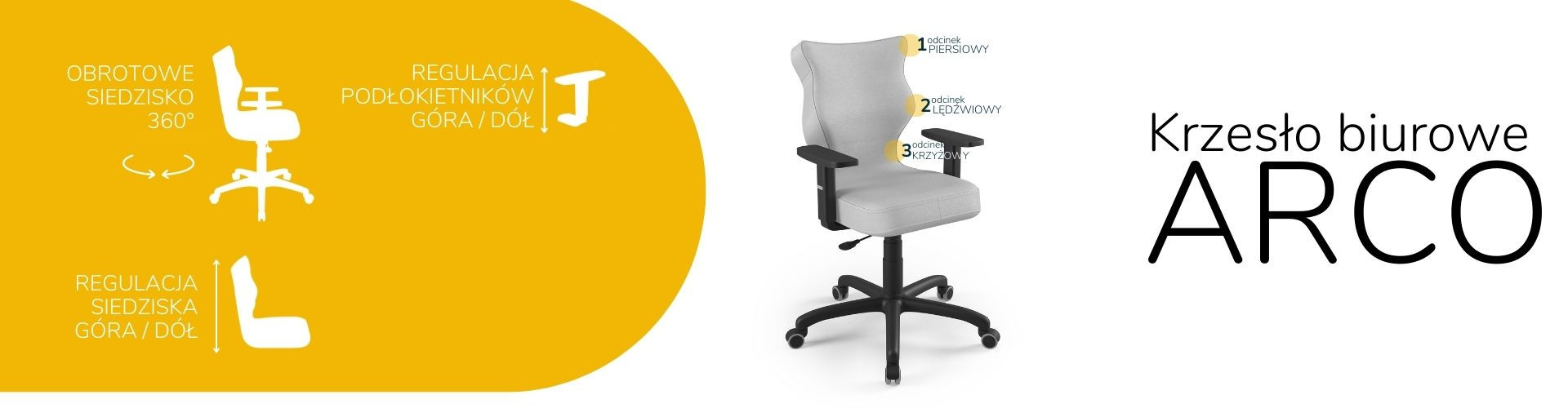Židle Arco je ergonomická kancelářská židle, která byla navržena pro lidi pracující vsedě. Čalouněná kancelářská židle Arco je vybavena měkkým a pohodlným sedákem, který poskytuje dostatečné pohodlí osobám sedícím u stolu po mnoho hodin. Kancelářská židle Arco je navíc vybavena speciálně tvarovaným opěradlem, které zmírňuje namáhání páteře. Konstrukce a tvar opěradla jsou profilovány tak, aby nedocházelo k přetěžování páteře a aby se zabránilo vadám držení těla, jako je skolióza. Profilovaná kancelářská židle poskytuje nejen stabilní oporu zádům sedícího, ale také ovlivňuje správnou polohu zad. Měkké plastové sedadlo netlačí na nohy a je pohodlné i při několikahodinové práci v jedné poloze.