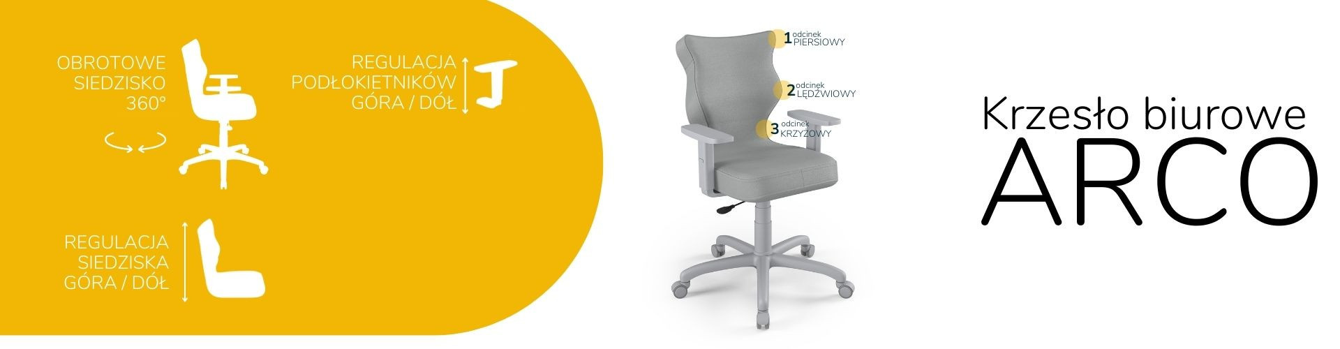Židle Arco je ergonomická kancelářská židle, která byla navržena pro lidi pracující vsedě. Čalouněná kancelářská židle Arco je vybavena měkkým a pohodlným sedákem, který poskytuje dostatečné pohodlí osobám sedícím u stolu po mnoho hodin. Kancelářská židle Arco je navíc vybavena speciálně tvarovaným opěradlem, které zmírňuje namáhání páteře. Konstrukce a tvar opěradla jsou profilovány tak, aby nedocházelo k přetěžování páteře a aby se zabránilo vadám držení těla, jako je skolióza. Profilovaná kancelářská židle poskytuje nejen stabilní oporu zádům sedícího, ale také ovlivňuje správnou polohu zad. Měkké plastové sedadlo netlačí na nohy a je pohodlné i při několikahodinové práci v jedné poloze.
