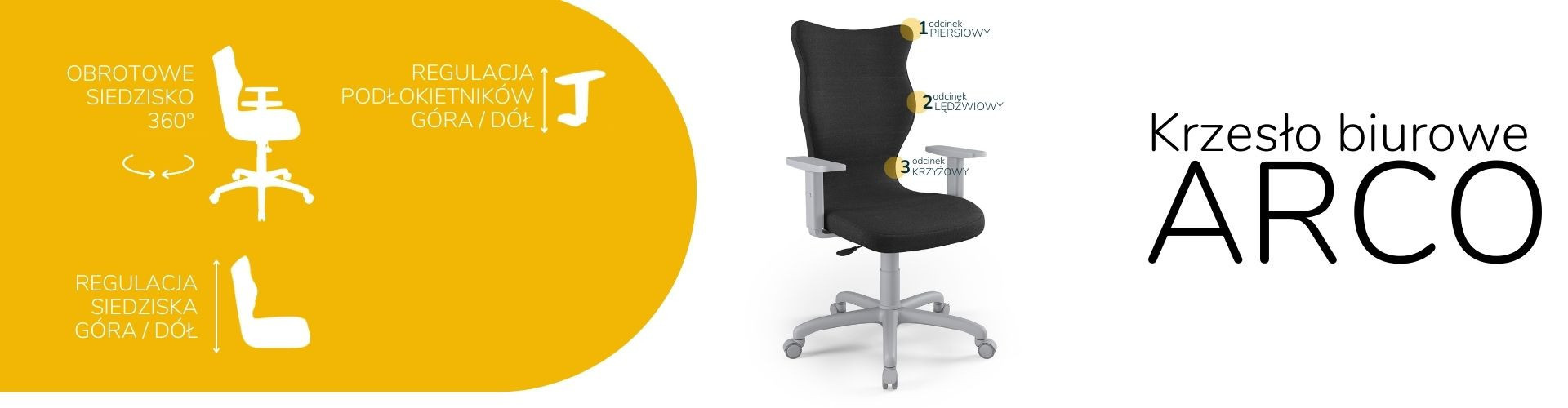 Židle Arco je ergonomická kancelářská židle, která byla navržena pro lidi pracující vsedě. Čalouněná kancelářská židle Arco je vybavena měkkým a pohodlným sedákem, který poskytuje dostatečné pohodlí osobám sedícím u stolu po mnoho hodin. Kancelářská židle Arco je navíc vybavena speciálně tvarovaným opěradlem, které zmírňuje namáhání páteře. Konstrukce a tvar opěradla jsou profilovány tak, aby nedocházelo k přetěžování páteře a aby se zabránilo vadám držení těla, jako je skolióza. Profilovaná kancelářská židle poskytuje nejen stabilní oporu zádům sedícího, ale také ovlivňuje správnou polohu zad. Měkké plastové sedadlo netlačí na nohy a je pohodlné i při několikahodinové práci v jedné poloze.