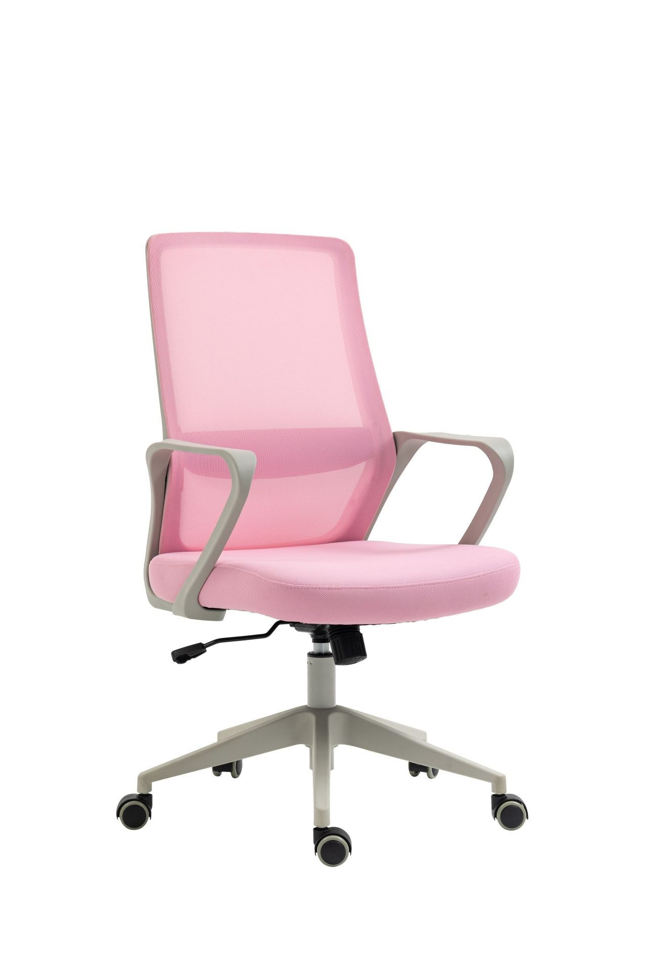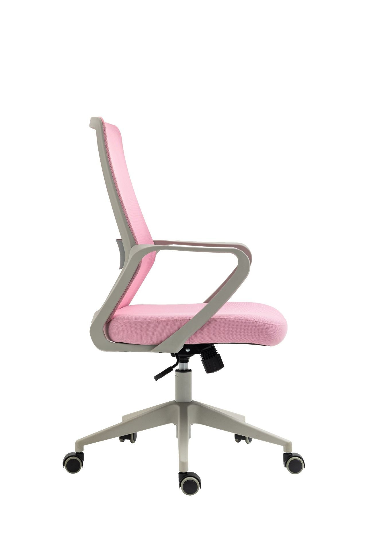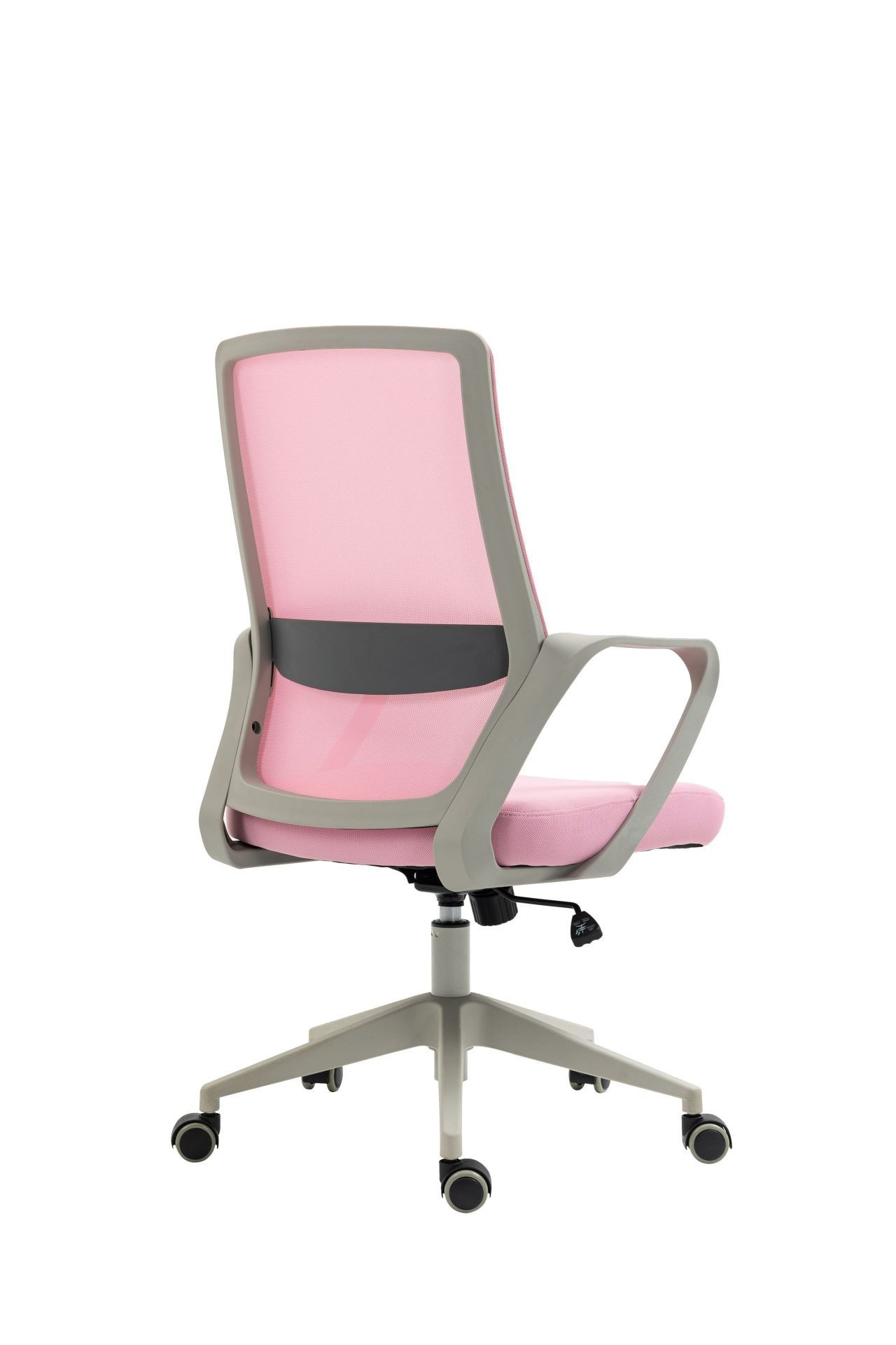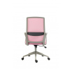 Rozměry: - celková šířka: 87 cm - šířka sedáku: 50 cm - hloubka sedáku: 46 cm - šířka opěradla: 45 cm - výška opěradla: 60 cm - celková výška: 99-109 cm - výška sedáku: 44-54 cm - výška područek: 64-74 cm Materiál: - čalounění: membránová tkanina + síťovina - základna a kolečka: PP plast Barva: - sedák + opěradlo: růžová - základna + područky: šedá Další: - mechanismus TILT - pevné područky