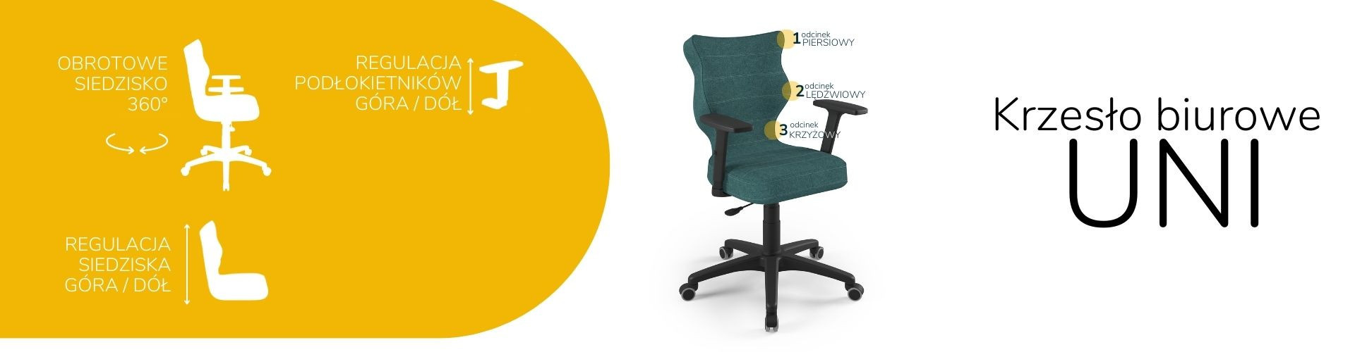 Židle Uni je ergonomická kancelářská židle, která byla navržena pro lidi pracující vsedě. Čalouněná kancelářská židle Uni je vybavena měkkým a pohodlným sedákem, který poskytuje dostatečné pohodlí osobám sedícím u stolu po mnoho hodin. Kancelářská židle Uni je navíc vybavena speciálně tvarovaným opěradlem, které zmírňuje namáhání páteře. Konstrukce a tvar opěradla jsou profilovány tak, aby nedocházelo k přetěžování páteře a aby se zabránilo vadám držení těla, jako je skolióza. Profilovaná kancelářská židle poskytuje nejen stabilní oporu zádům sedícího, ale také ovlivňuje správnou polohu zad. Měkké plastové sedadlo netlačí na nohy a je pohodlné i při několikahodinové práci v jedné poloze.