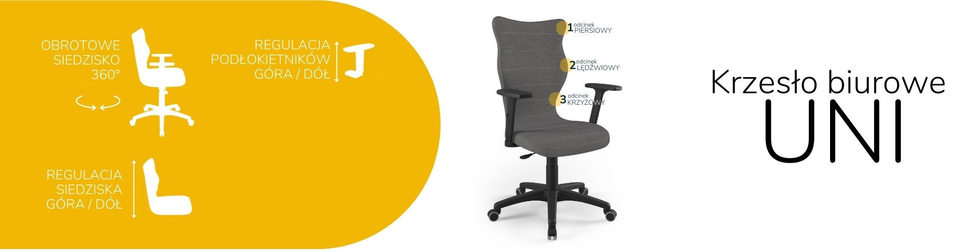 Židle Uni je ergonomická kancelářská židle, která byla navržena pro lidi pracující vsedě. Čalouněná kancelářská židle Uni je vybavena měkkým a pohodlným sedákem, který poskytuje dostatečné pohodlí osobám sedícím u stolu po mnoho hodin. Kancelářská židle Uni je navíc vybavena speciálně tvarovaným opěradlem, které zmírňuje namáhání páteře. Konstrukce a tvar opěradla jsou profilovány tak, aby nedocházelo k přetěžování páteře a aby se zabránilo vadám držení těla, jako je skolióza. Profilovaná kancelářská židle poskytuje nejen stabilní oporu zádům sedícího, ale také ovlivňuje správnou polohu zad. Měkké plastové sedadlo netlačí na nohy a je pohodlné i při několikahodinové práci v jedné poloze.