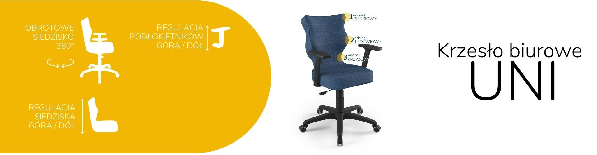 Židle Uni je ergonomická kancelářská židle, která byla navržena pro lidi pracující vsedě. Čalouněná kancelářská židle Uni je vybavena měkkým a pohodlným sedákem, který poskytuje dostatečné pohodlí osobám sedícím u stolu po mnoho hodin. Kancelářská židle Uni je navíc vybavena speciálně tvarovaným opěradlem, které zmírňuje namáhání páteře. Konstrukce a tvar opěradla jsou profilovány tak, aby nedocházelo k přetěžování páteře a aby se zabránilo vadám držení těla, jako je skolióza. Profilovaná kancelářská židle poskytuje nejen stabilní oporu zádům sedícího, ale také ovlivňuje správnou polohu zad. Měkké plastové sedadlo netlačí na nohy a je pohodlné i při několikahodinové práci v jedné poloze.