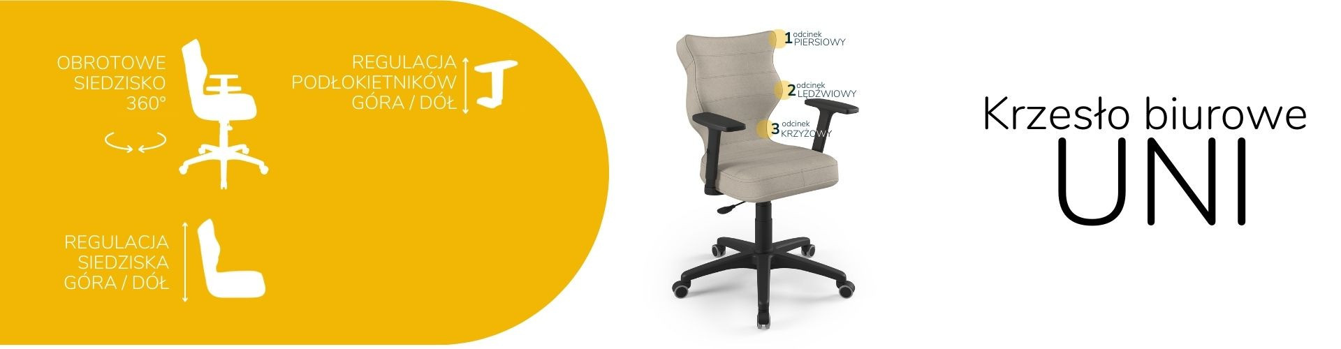 Židle Uni je ergonomická kancelářská židle, která byla navržena pro lidi pracující vsedě. Čalouněná kancelářská židle Uni je vybavena měkkým a pohodlným sedákem, který poskytuje dostatečné pohodlí osobám sedícím u stolu po mnoho hodin. Kancelářská židle Uni je navíc vybavena speciálně tvarovaným opěradlem, které zmírňuje namáhání páteře. Konstrukce a tvar opěradla jsou profilovány tak, aby nedocházelo k přetěžování páteře a aby se zabránilo vadám držení těla, jako je skolióza. Profilovaná kancelářská židle poskytuje nejen stabilní oporu zádům sedícího, ale také ovlivňuje správnou polohu zad. Měkké plastové sedadlo netlačí na nohy a je pohodlné i při několikahodinové práci v jedné poloze.