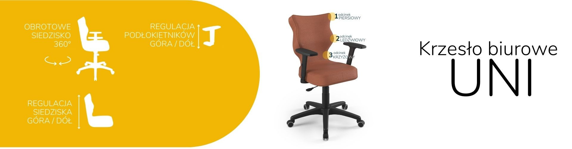 Židle Uni je ergonomická kancelářská židle, která byla navržena pro lidi pracující vsedě. Čalouněná kancelářská židle Uni je vybavena měkkým a pohodlným sedákem, který poskytuje dostatečné pohodlí osobám sedícím u stolu po mnoho hodin. Kancelářská židle Uni je navíc vybavena speciálně tvarovaným opěradlem, které zmírňuje namáhání páteře. Konstrukce a tvar opěradla jsou profilovány tak, aby nedocházelo k přetěžování páteře a aby se zabránilo vadám držení těla, jako je skolióza. Profilovaná kancelářská židle poskytuje nejen stabilní oporu zádům sedícího, ale také ovlivňuje správnou polohu zad. Měkké plastové sedadlo netlačí na nohy a je pohodlné i při několikahodinové práci v jedné poloze.
