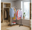Stojan na šaty s odkladačem v černém provedení kombinuje pevnou kovovou konstrukci s chromovanými prvky a plastovými doplňky pro snadnou manipulaci. Výšku lze nastavit podle potřeby, což umožňuje flexibilní uspořádání oděvů různých délek. Otočný mechanismus 360° zajišťuje pohodlný přístup ke všem zavěšeným kouskům, zatímco spodní odkladač nabízí prostor pro uložení bot nebo krabic. Stabilní podstava na kolečkách umožňuje snadné přemístění stojanu bez námahy. Díky kombinaci materiálů je stojan navržen pro dlouhou životnost a snadnou údržbu.