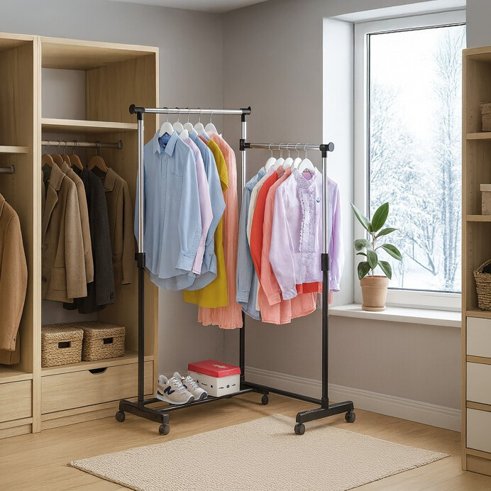 Stojan na šaty s odkladačem v černém provedení kombinuje pevnou kovovou konstrukci s chromovanými prvky a plastovými doplňky pro snadnou manipulaci. Výšku lze nastavit podle potřeby, což umožňuje flexibilní uspořádání oděvů různých délek. Otočný mechanismus 360° zajišťuje pohodlný přístup ke všem zavěšeným kouskům, zatímco spodní odkladač nabízí prostor pro uložení bot nebo krabic. Stabilní podstava na kolečkách umožňuje snadné přemístění stojanu bez námahy. Díky kombinaci materiálů je stojan navržen pro dlouhou životnost a snadnou údržbu.