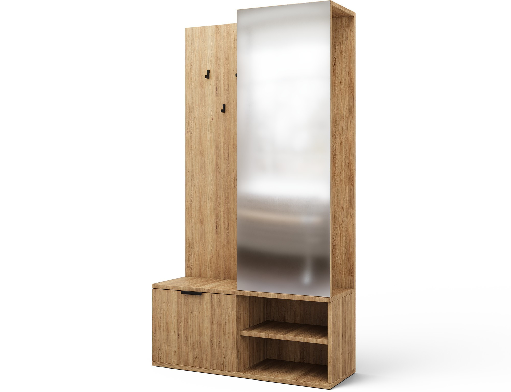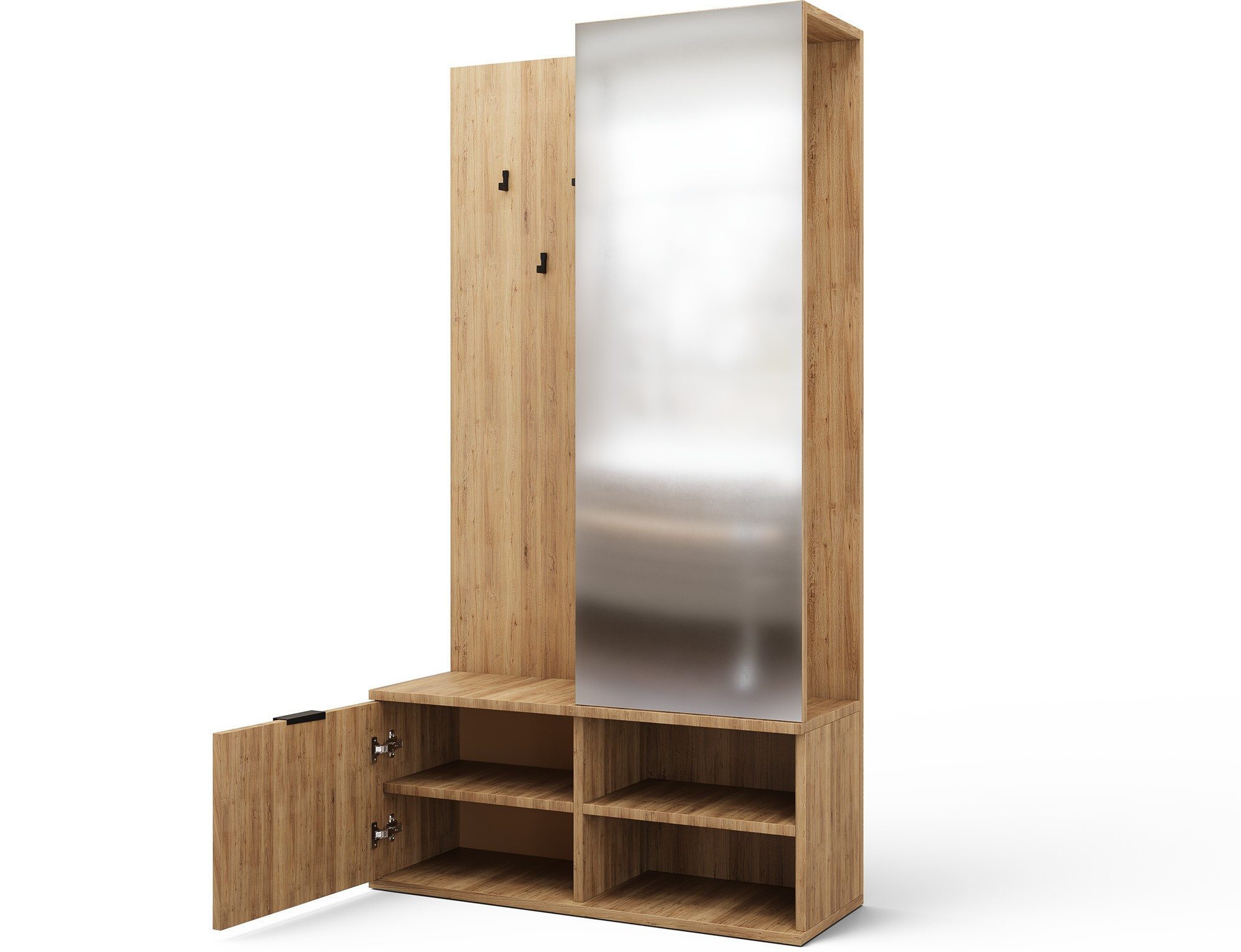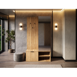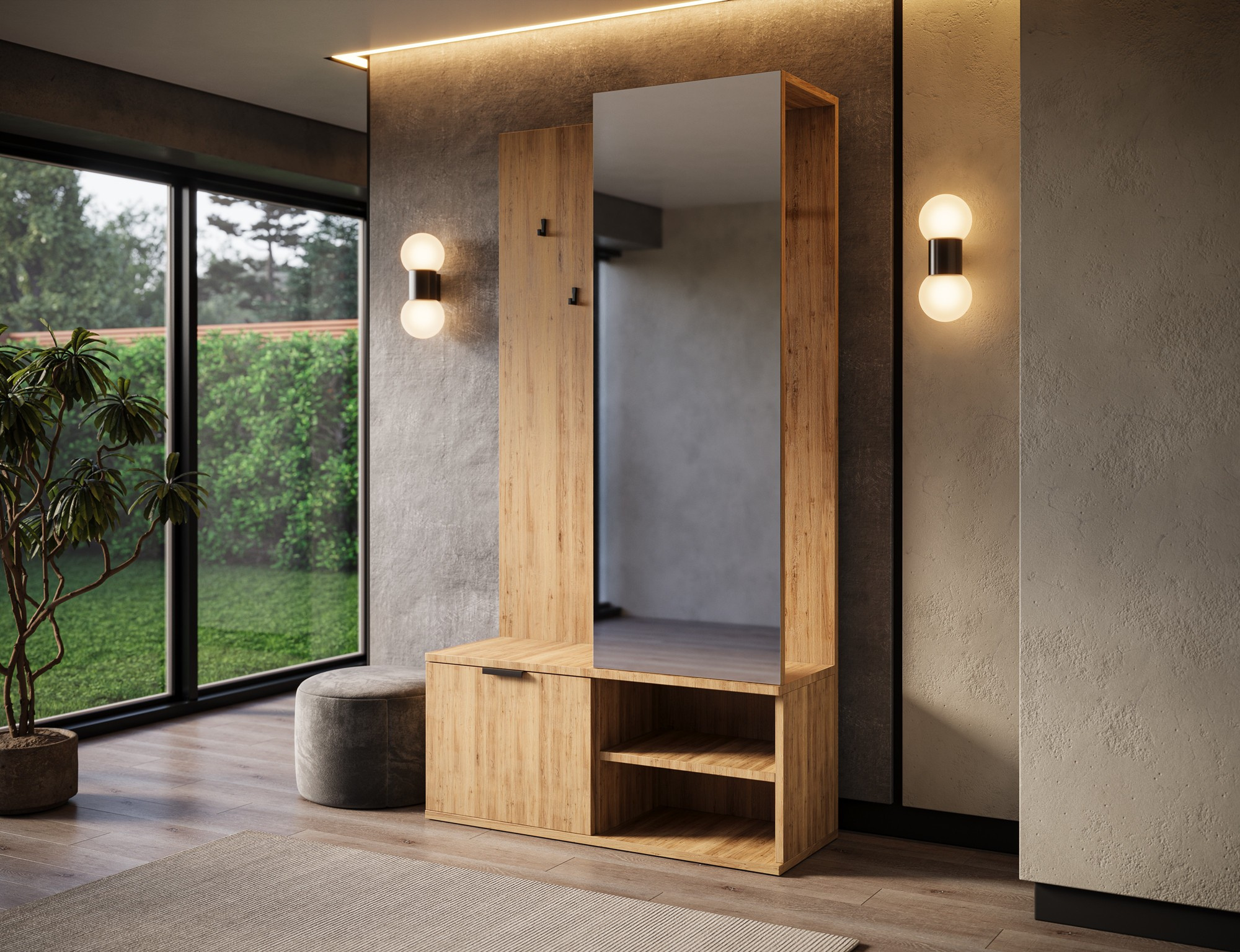 Chodbaová skříň Oturra je moderní, štíhlý kus nábytku, který kombinuje věšák na kabáty, zrcadlo a úložný prostor na boty v jednom elegantním celku. Se šířkou 100 cm, výškou 189 cm a hloubkou 35 cm funguje отлично i v úzké chodbě, což pomáhá udržovat vstupní prostor uklizený. Horní část obsahuje lištu pro ramínka na bundy a kabáty, spolu s kovovým nábytkovým háčkem na doplňky, zatímco spodní část nabízí praktickou skříňku a dvě police na boty nebo jiné předměty. Šatní skříň Oturra je vyrobena z odolné laminované desky: čela, korpus a zadní/vnitřní panely jsou všechny vyrobeny ze stejného materiálu a hrany jsou zakončeny PVC, což zvyšuje odolnost proti poškození a usnadňuje čištění. Korpus a police jsou silné 16 mm a celá jednotka váží 53 kg, což zajišťuje stabilitu a pevnou kvalitu po mnoho let. Je to ideální volba, pokud hledáte funkční minimalistickou předsíňovou skříň se zrcadlem, tyčí na oblečení a úložným prostorem na boty.