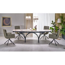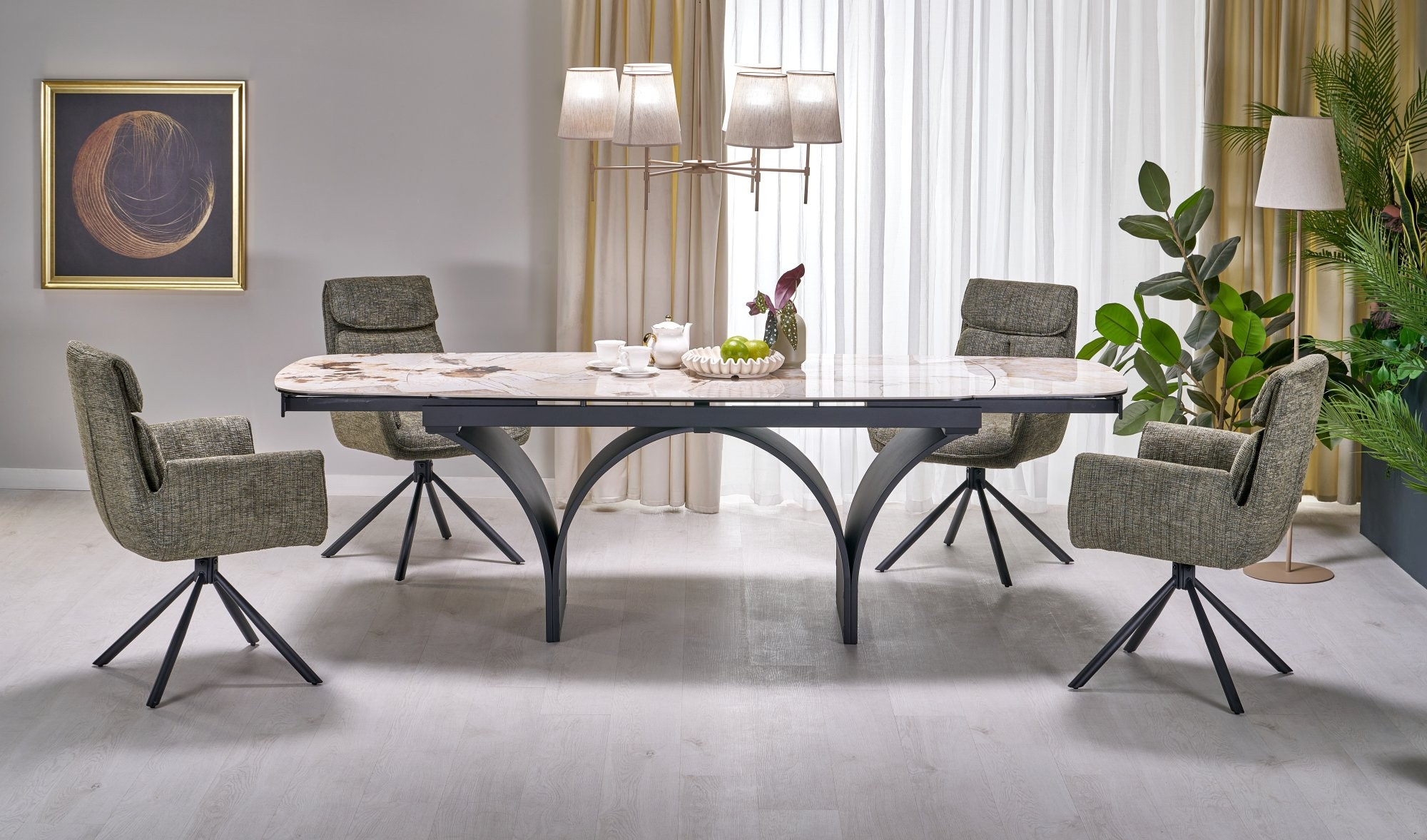 rozměry: 180-260/90/74 cm, stůl rozkládací, materiál: keramika / sklo / ocel lakovaná práškovou barvou, barva: deska - béžový mramor, noha - černá
