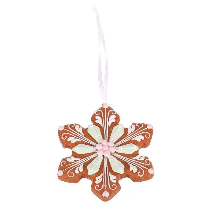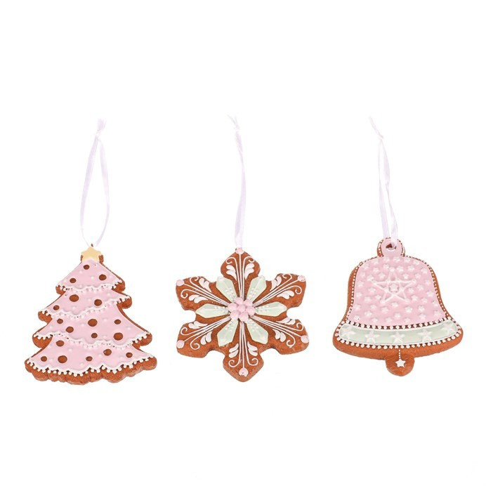Závěsné perníkové dekorace v podobě stromku, sněhové vločky a zvonku, budou skvělou volbou pro vánoční výzdobu. Jsou sice vyrobené z polyresinu, ale vypadají skutečně jako by je upekl a vyzdobil sám mistr cukrář. Kombinace hnědé barvy s bílou, zelenou a růžovou polevou je prostě kouzelná. Jedná se o mix 3 druhů, ale cena uvedená na hlavičce produktu je za jednu ozdobu.