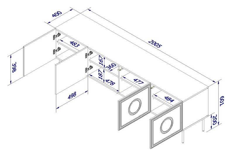 skříňka RTV 200 (4D) rozměry: š/š/g-cm/cm/cm, materiál: Korpus: 16mm matná laminovaná deska Čelo: 16mm MDF deska Nohy: kovové, černé, výška 20 cm Úchyty: systém PUSH - CLICK