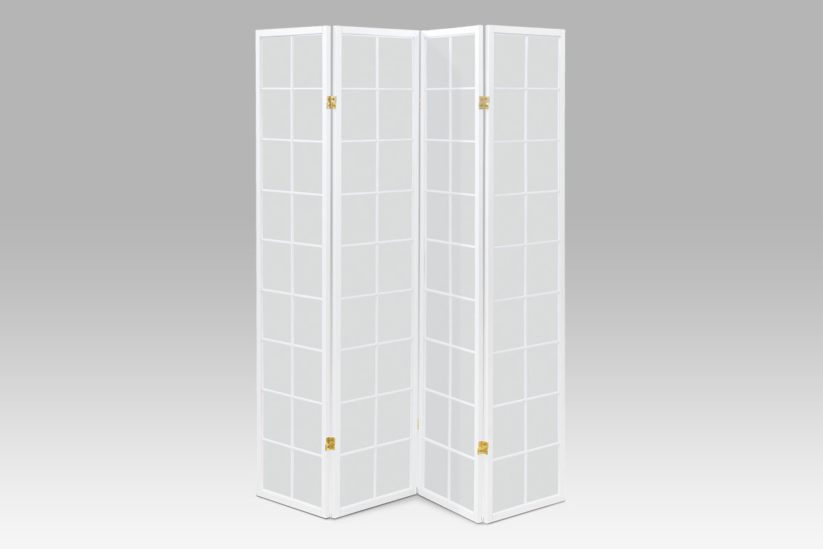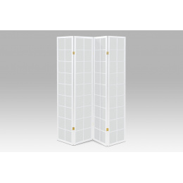 4dílný volně stojící paraván s konstrukcí z masivního smrkového dřeva v bílé matné barvě a výplní z bílé netkané textilie. Plní nejen funkci okrasnou, ale také praktickou. Lze jej použít jako zástěnu nebo diskrétní i optickou dělící příčku nejen v bytě, ale i v komerčních prostorách. Díky skládací konstrukci a celkové nízké hmotnosti jej lze bez problémů přemísťovat a manipulovat s ním. Kombinace dřeva a netkané textilie působí vzdušným dojmem, stylově lze paraván umístit do jakkoli zařízeného interiéru. V každém si najde zasloužené místo. Výška paravánu je 180 cm, šíře jednoho dílu 43,5 cm, celková plná šíře je 174 cm. Tloušťka stěny jsou 2 cm. Stěny paravánu jsou k sobě připevněny kovovými pomosazenými panty. Celková hmotnost je 6,5 kg.