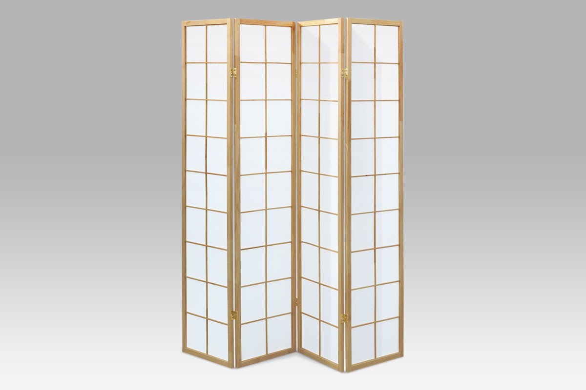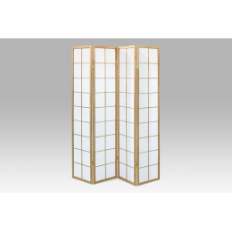 4dílný volně stojící paraván s konstrukcí z masivního smrkového dřeva v přírodním odstínu, lakovaný transparentním lakem a výplní z bílé netkané textilie. Plní nejen funkci okrasnou, ale také praktickou. Lze jej použít jako zástěnu nebo diskrétní i optickou dělící příčku nejen v bytě, ale i v komerčních prostorách. Díky skládací konstrukci a celkové nízké hmotnosti jej lze bez problémů přemísťovat a manipulovat s ním. Kombinace dřeva a netkané textilie působí vzdušným dojmem, stylově lze paraván umístit do jakkoli zařízeného interiéru. V každém si najde zasloužené místo. Výška paravánu je 180 cm, šíře jednoho dílu 43,5 cm, celková plná šíře je 174 cm. Tloušťka stěny jsou 2 cm. Stěny paravánu jsou k sobě připevněny kovovými pomosazenými panty. Celková hmotnost je 6,5 kg.
