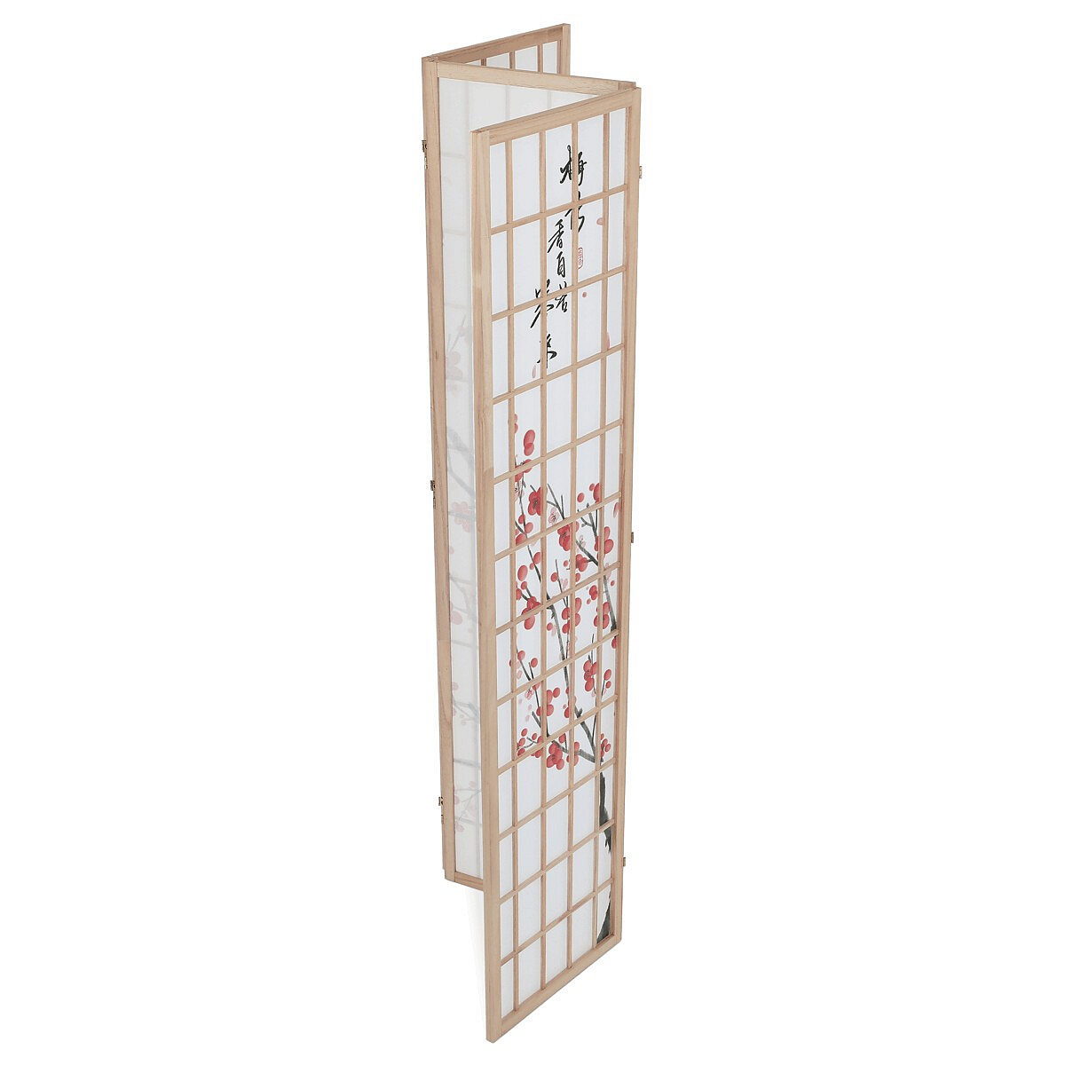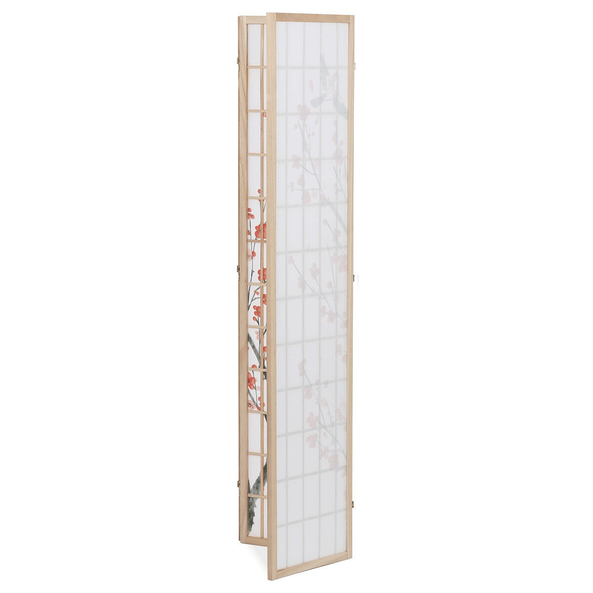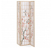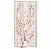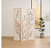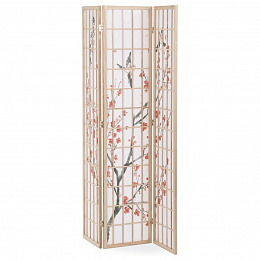 Třípanelový paraván z masivního smrkového dřeva v přírodním odstínu nabízí lehkou a vzdušnou přepážku s bílou netkanou textilií, která je zdobená jemným motivem větví s květy a ptáky v černých a červených tónech. Pevné dřevěné rámy zajišťují stabilitu a zároveň umožňují snadné skládání a přemístění. Paraván je vhodný pro optické oddělení prostoru v interiéru, přičemž jeho přírodní barevnost a decentní dekor vytvářejí klidnou atmosféru. Díky lehkému materiálu se snadno udržuje a je ideální pro použití v obývacích pokojích, ložnicích nebo kancelářích.
