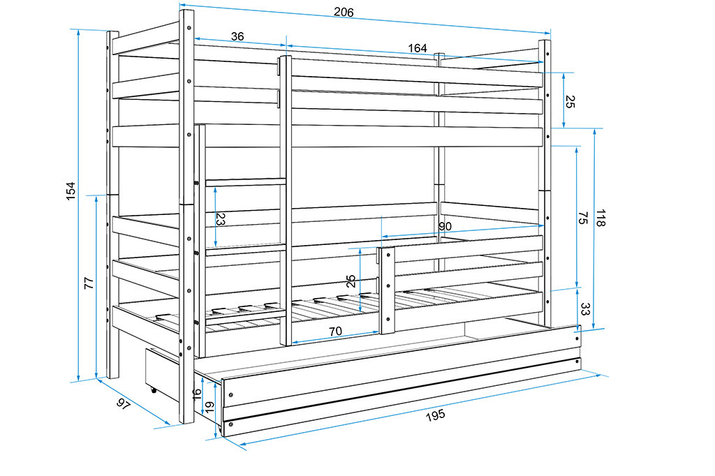 Dětská patrová postel Norbert je určena pro ty, kteří pro své dítě hledají funkčnost, moderní design a kvalitu. Postel je vyrobena z borovicového dřeva a má stabilní konstrukci. Má zaoblené hrany a zábrana na horní i dolní posteli, zajišťují bezpečnost a pohodlí dítěte. Žebřík si můžete podle potřeby umístit na pravou, nebo levou stranu postele. V případě potřeby je možno palandu rozložit na dvě samostatné postele. Součástí postele je 2x zábrana, praktický úložný prostor na kolečkách, 2x rošt a 2x pěnová matrace se snímatelným potahem. Tloušťka matrace je 7cm. Plocha pro spaní je 2x 90x200 cm. Postel je dodávána v demontu a součástí je montážní plánek včetně všech potřebných spojovacích materiálů. Vyobrazené dekorace nejsou v ceně. Zobrazení barev na fotografii se může od skutečnosti nepatrně lišit.