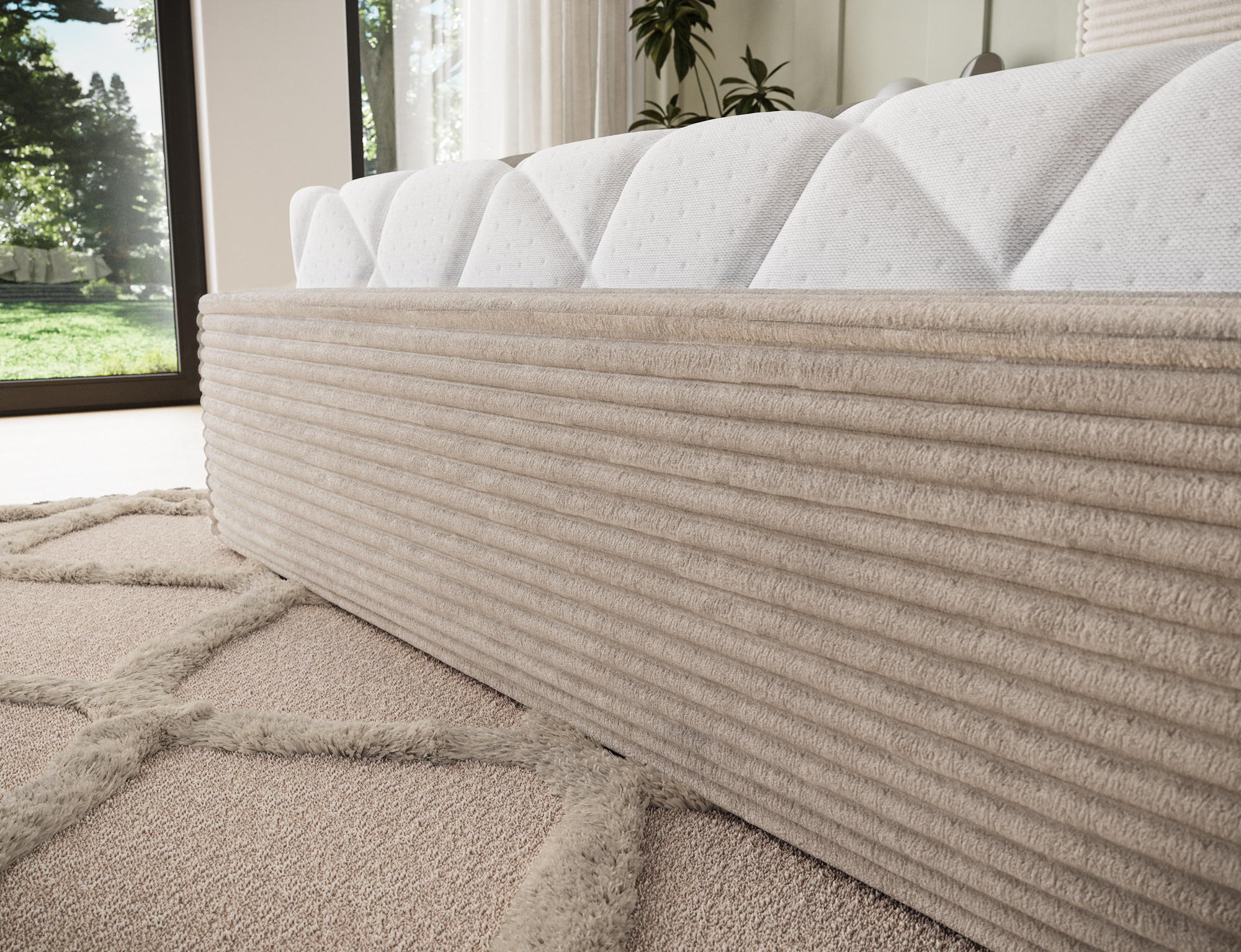 Postel do ložnice Pesillo kombinuje eleganci a funkčnost v moderním designu. Model je k dispozici ve třech velikostních variantách: 140x200 cm, 160x200 cm a 180x200 cm, což vám umožní dokonale přizpůsobit postel rozměrům vaší ložnice a vašim individuálním potřebám. Celková výška postele je 103 cm, zatímco její hloubka měří 220 cm. Šířka závisí na vybraném modelu a je 158 cm, 178 cm nebo 198 cm. Pěnová výplň T2130 zajišťuje pohodlí a odolnost, zatímco robustní černé plastové nohy nábytku poskytují stabilitu a elegantní vzhled. Postel Pesillo je vybavena praktickým úložným prostorem na lůžkoviny, což umožňuje efektivní využití prostoru a snadnou organizaci. Navržen v moderním stylu, dokonale zapadá do současných trendů interiérového designu, vytváří útulnou a elegantní atmosféru ideální pro relaxaci.
