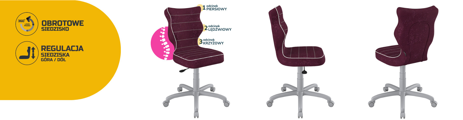 Konkávně-konvexní tvar opěradla zajišťuje správné nastavení páteře a poskytuje uživateli maximální úlevu pro páteř. Vypouklá část sedáku v úrovni bederní oblasti umožňuje správnou polohu nohou a hýždí a ponechává je v jejich přirozené poloze. Dobrá židle pečuje o hrudní, bederní a křížovou oblast.