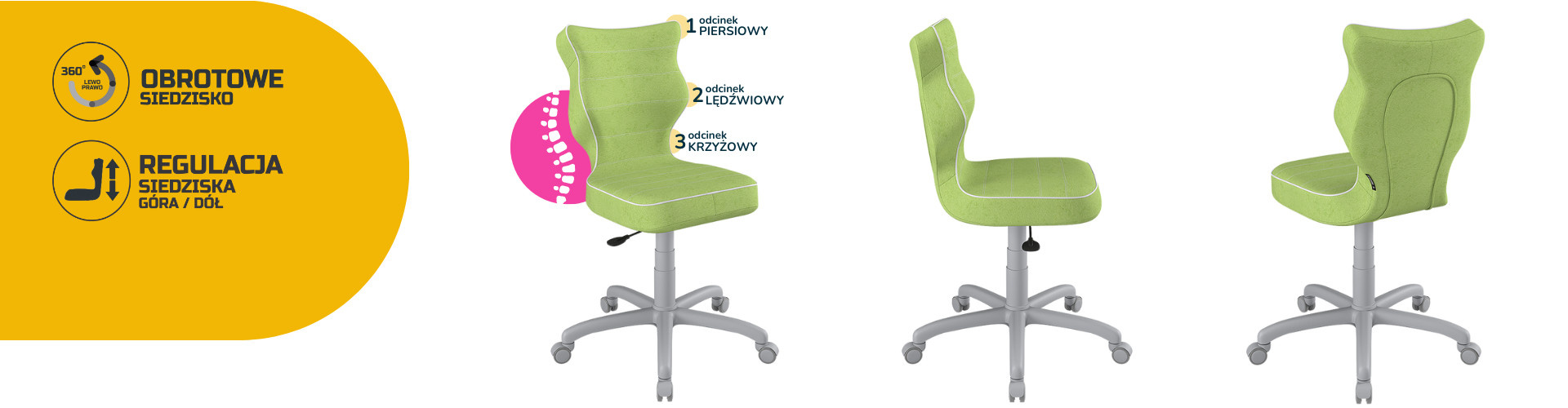 Konkávně-konvexní tvar opěradla zajišťuje správné nastavení páteře a poskytuje uživateli maximální úlevu pro páteř. Vypouklá část sedáku v úrovni bederní oblasti umožňuje správnou polohu nohou a hýždí a ponechává je v jejich přirozené poloze. Dobrá židle pečuje o hrudní, bederní a křížovou oblast.
