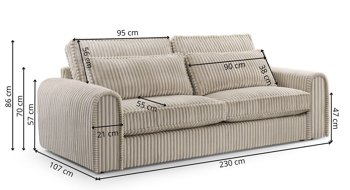 Pohovka CASSINI je navržena s ohledem na maximální pohodlí a estetiku. Její šířka 230 cm a hloubka 107 cm poskytují dostatek prostoru pro relaxaci a odpočinek. Výška sedu 47 cm je optimální pro pohodlné sezení, zatímco celková výška pohovky 86 cm dodává interiéru vzdušnost a eleganci.