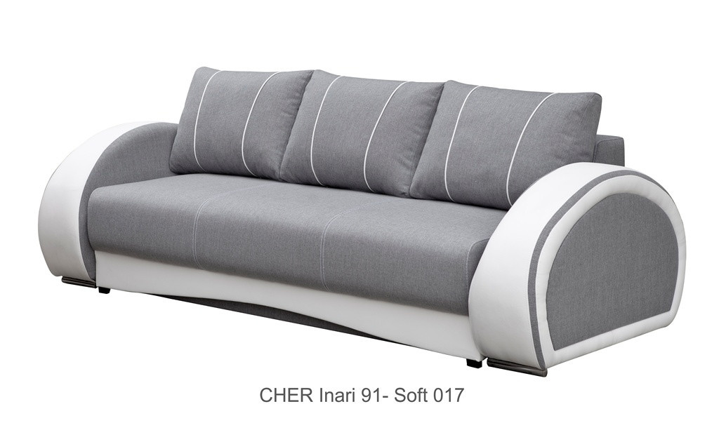 Pohovka CHER je dokončena v modernistickém designu, takže kolem ní nikdo neprojde lhostejně. Pohovka se zaoblenými boky může být čalouněna látkou nebo ekokůží, které jsou k dispozici v široké škále barev ve vzorníku barev. Třímístná pohovka je vybavena nádobou na lůžkoviny a funkcí spaní, takže ji lze rozložit. V základní verzi pohovky jsou vložky vyrobeny z bílé ekokůže. CHER je pohovka postavená na dřevěném rámu a doplněná chromovanými nohami. Rozkládání pohovky zvládnou i starší nebo mladší lidé, protože je vybavena automatickým asistenčním systémem rozkládání typu DL. Sedák pohovky je vyplněn bonelovými a vlnitými pružinami, takže si budeme jisti komfortem a pohodlím i při mnohahodinovém používání.