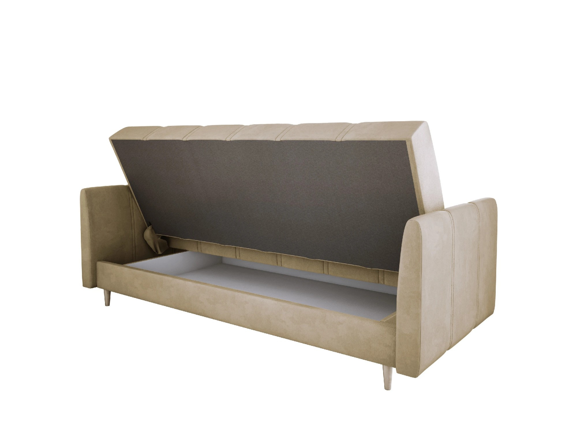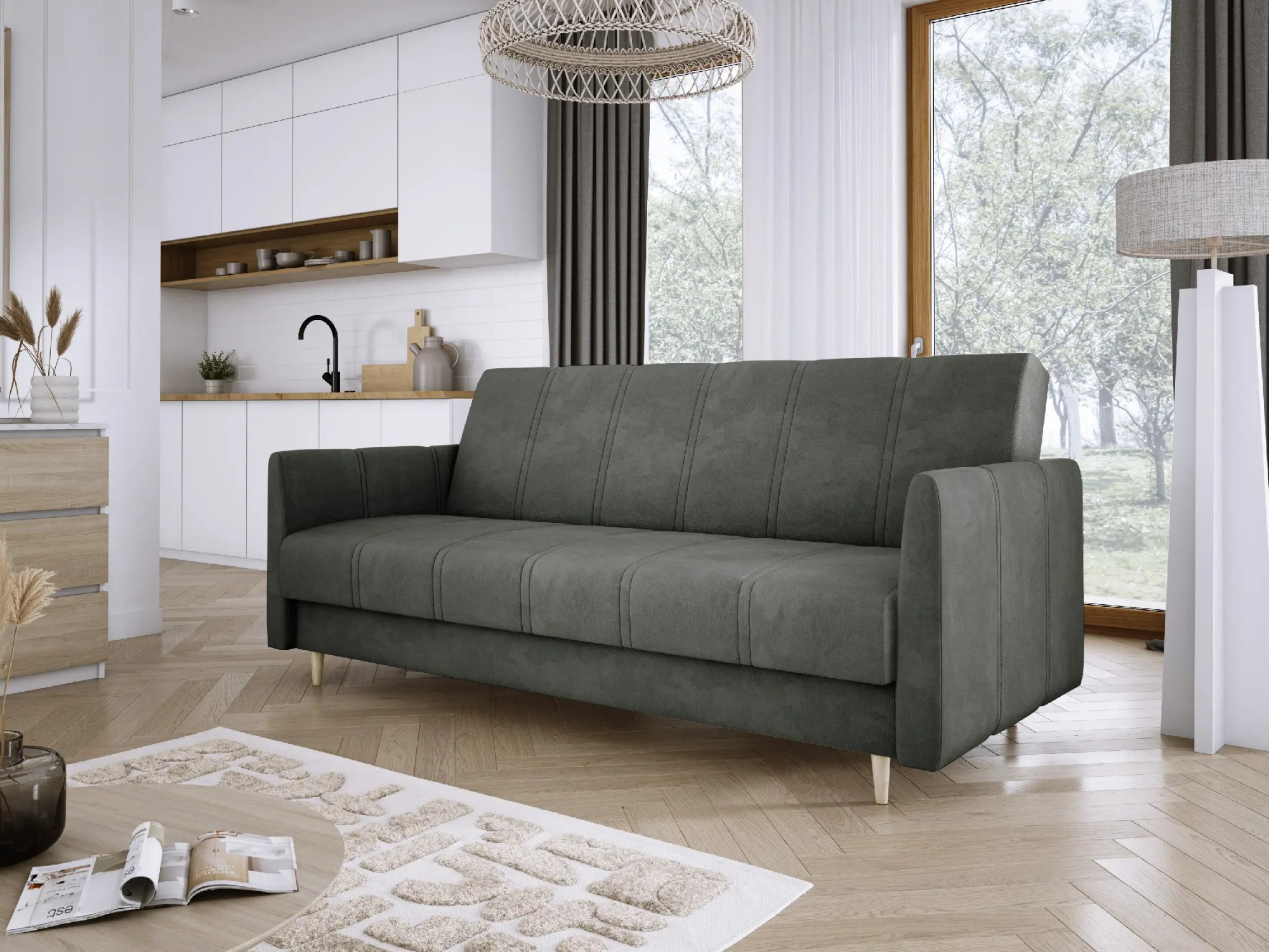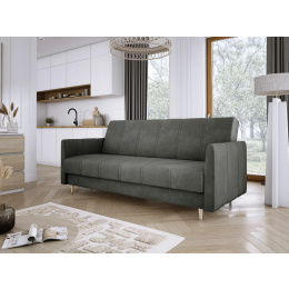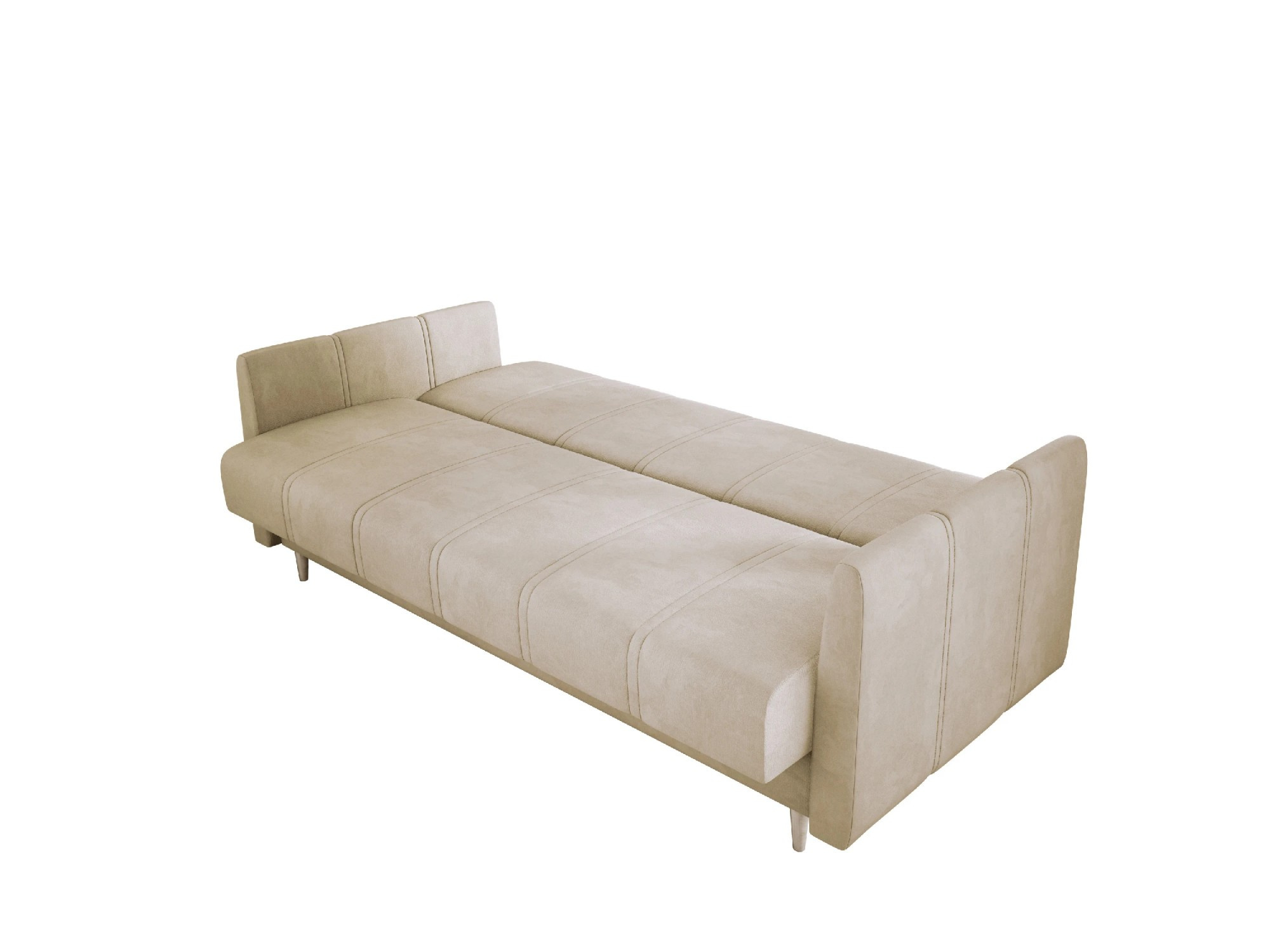 Stylová a funkční pohovka na spaní PORTO Pohovka PORTO je moderní rozkládací pohovka, která dokonale vyhovuje potřebám uživatelů, kteří si cení jak pohodlí, tak praktických řešení. Díky snadnému mechanismu rozkládání typu klik-klak ji bleskově přeměníte na pohodlnou postel pro každodenní spaní, čímž ušetříte místo i čas. Vnitřek pohovky Porto vyplněný bonellovými pružinami a vysoce elastickou pěnou zaručuje správnou oporu a pohodlí, bez ohledu na denní dobu. Stylové dvojité hluboké prošívání dodává eleganci, a dřevěné nožky přinášejí lehkost formy a usnadňují úklid pod nábytkem. Mírně vychýlené područky směrem ven nejen zdůrazňují moderní linii pohovky, ale také zvyšují komfort odpočinku. Sofa PORTO je vybavena úložným prostorem na ložní prádlo, který umožňuje pohodlně ukládat deky, polštáře nebo jiné textilie. To je skvělá volba do obývacího pokoje, pokoje pro hosty nebo garsonky – nábytek spojující design, funkčnost a pohodlí v jednom. Vlastnosti produktu automatická pohovka klik-klak – rychlá a intuitivní přeměna pohovky na pohodlnou postel, celá spací plocha s bonellovými pružinami a elastickou pěnou pro lepší komfort, vestavěný úložný prostor na ložní prádlo – praktické místo pro uložení, prošívané sedadlo a opěradlo – elegantní prvek a větší pohodlí, vysoké dřevěné nožky – stylové a funkční, mírně vykloněné ven područky — zdůrazňují moderní styl pohovky, zadní část potažená technickou tkaninou (wigofil) – estetické zakončení maskující úložný prostor, Rozměry pohovky spací plocha: 190 × 120 cm, šířka: 206 cm, hloubka: 88 cm, výška: 95 cm, výška sedadla: 46 cm, hloubka sedadla: 55 cm, výška opěradla: 55 cm, výška nožek: 10 cm. *Všechny rozměry jsou uváděny s tolerancí +/- 3 cm