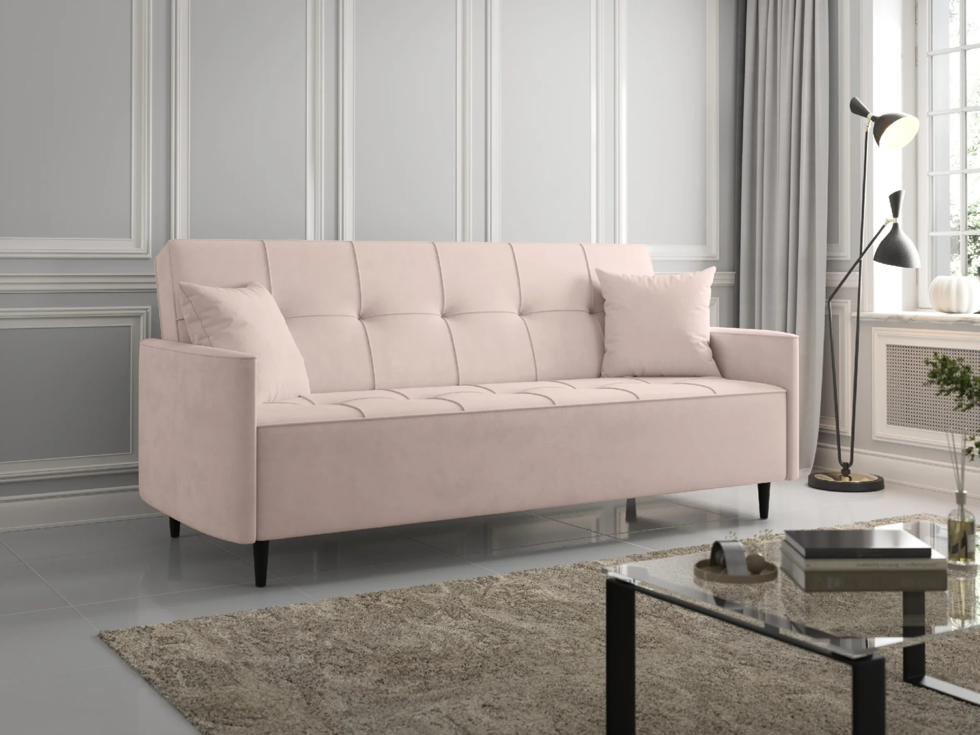 Pohovka VELLUTO – elegance a pohodlí v moderním provedení Pohovka VELLUTO je kombinací vytříbeného stylu a vysokého komfortu, která se hodí jak do moderních, tak i klasických interiérů. Solidní rám vyrobený ze dřeva a nábytkové desky zajišťuje stabilitu a trvanlivost, což činí nábytek investicí na dlouhá léta. Sedák vyplněný bonellovými pružinami a vysoce kvalitní pěnou zaručuje ideální rovnováhu mezi měkkostí a odolností proti deformacím, což se promítá do výjimečného pohodlí při každodenním používání. Elegantní, vysoké opěradlo s ozdobným prošíváním a hladké, rovné boky dodávají pohovce nadčasový charakter. Pohovka byla potažena příjemnou na dotek sametovou látkou, která jemně odráží světlo a dodává interiéru luxusní vzhled. Díky tlumené barevnosti se pohovka VELLUTO snadno začlení do různorodých aranžmá – od minimalistických po glamour. Model je vybaven funkcí spaní s mechanismem typu Klik-Klak, což umožňuje rychlé a pohodlné rozložení do podoby postele. Prostorný úložný prostor na ložní prádlo umožní pohodlné uložení dek, polštářů nebo přikrývek, čímž udrží pořádek v místnosti. Pohovka VELLUTO je nábytek, který spojuje elegantní vzhled s praktickými řešeními. Díky pečlivému provedení, pohodlným sedadlům a univerzálnímu designu bude ozdobou každého obývacího pokoje, denního pokoje nebo pokoje pro hosty. Vlastnosti produktu Mechanismus rozkládání typu Klik-Klak – jednoduchý a rychlý systém, který během několika okamžiků umožňuje proměnit pohovku v pohodlnou postel. Plocha na spaní s výplní z bonellových pružin a pěny – zajišťuje optimální oporu těla, komfort a dlouhou životnost bez rizika deformací. Solidní konstrukce – rám vyrobený z masivního dřeva a nábytkové desky zaručuje stabilitu a spolehlivost po mnoho let používání. Prostorný úložný prostor na ložní prádlo – praktické řešení, které umožňuje pohodlně ukládat deky, polštáře a ložní prádlo, a zároveň udržovat pořádek v obývacím pokoji. Vysoké, prošívané opěradlo – elegantní prvek, který dodává nábytku nadčasový charakter a zlepšuje pohodlí při odpočinku. Stylová sametová tkanina – měkká, příjemná na dotek a jemně lesklá, dodává interiéru eleganci a třídu. Univerzální design – díky tlumené barevnosti a klasickému tvaru se pohovka skvěle hodí do různých stylů aranžmá. Dokončení zadní části nábytku látkou – umožňuje umístit pohovku kdekoli, nejen u stěny. Rozměry pohovky, plocha na spaní: 190 × 120 cm, šířka: 208 cm, hloubka: 95 cm, výška: 95 cm, výška nožek: 13 cm, výška sedáku: 47 cm, hloubka sedáku: 55 cm, výška opěradla: 55 cm, *Všechny rozměry jsou uváděny s tolerancí +/- 3 cm