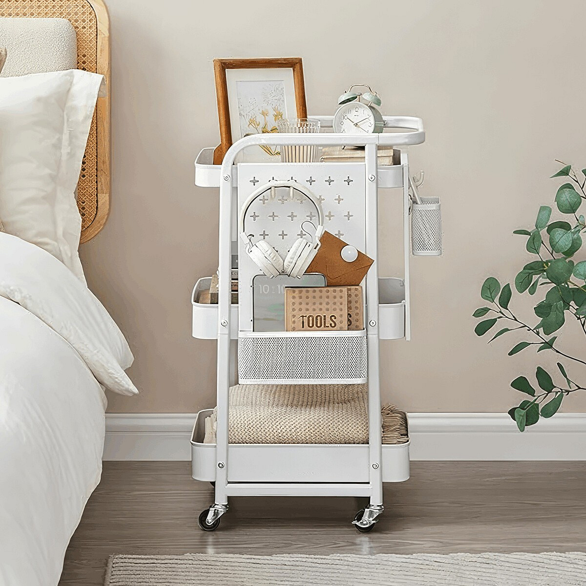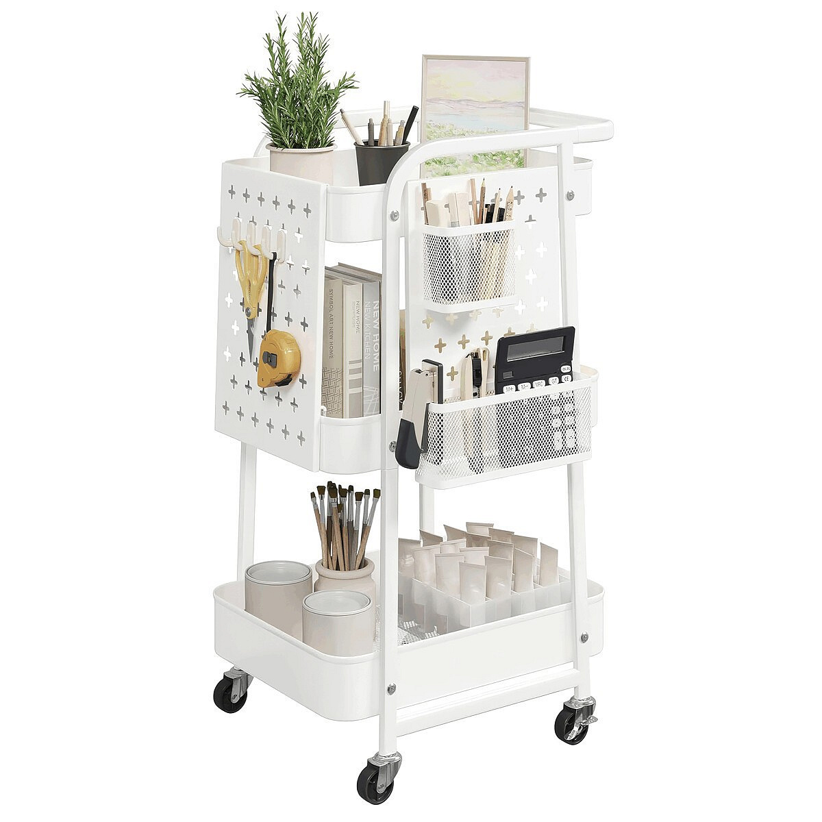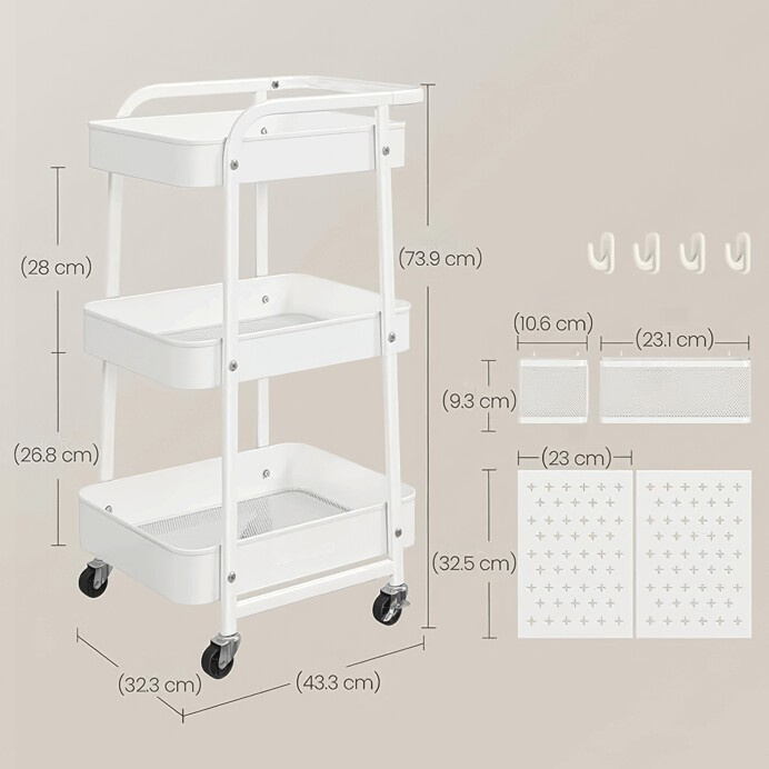 Pojízdný úložný vozík v bílém provedení je vyroben z pevného kovu s práškovým lakem, který zajišťuje odolnost proti poškrábání a snadnou údržbu. Konstrukce nabízí tři prostorné police s perforovanými bočními panely, které umožňují připevnění doplňkových košíků a háčků pro efektivní organizaci drobných předmětů. Vozík je vybaven čtyřmi otočnými kolečky, z nichž dvě mají brzdový mechanismus pro stabilní fixaci na místě. Díky kompaktním rozměrům a mobilitě je ideální pro použití v kanceláři, dílně nebo domácnosti k přehlednému uskladnění nářadí, kancelářských potřeb či kreativních materiálů.