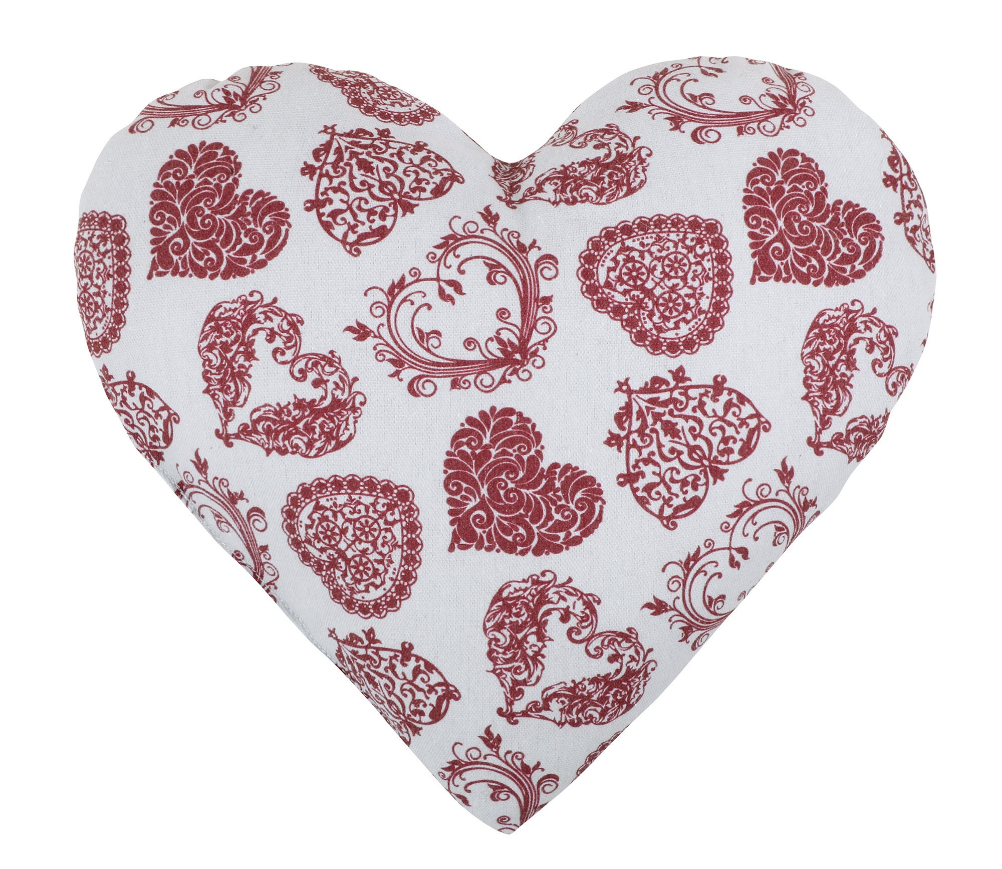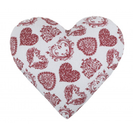 Romantický polštářek ve tvaru srdce je krásným doplňkem, který vnese do interiéru lásku, pohodu a něžnou atmosféru. Jemný světlý podklad zdobí bohatý vzor červených srdcí s ornamenty, díky kterému polštář působí elegantně i hravě zároveň.