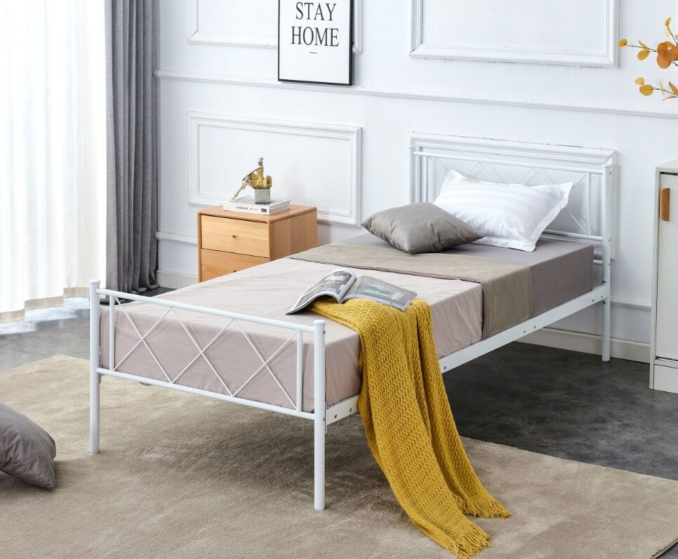 Rozměry: - Celková délka: 206,50 cm - celková šířka: 96 cm - výška čela: 81 cm výška čela postele - plocha na spaní: 90x200 cm Materiál: - Materiál: kov s práškovým nástřikem Barva: - Bílá