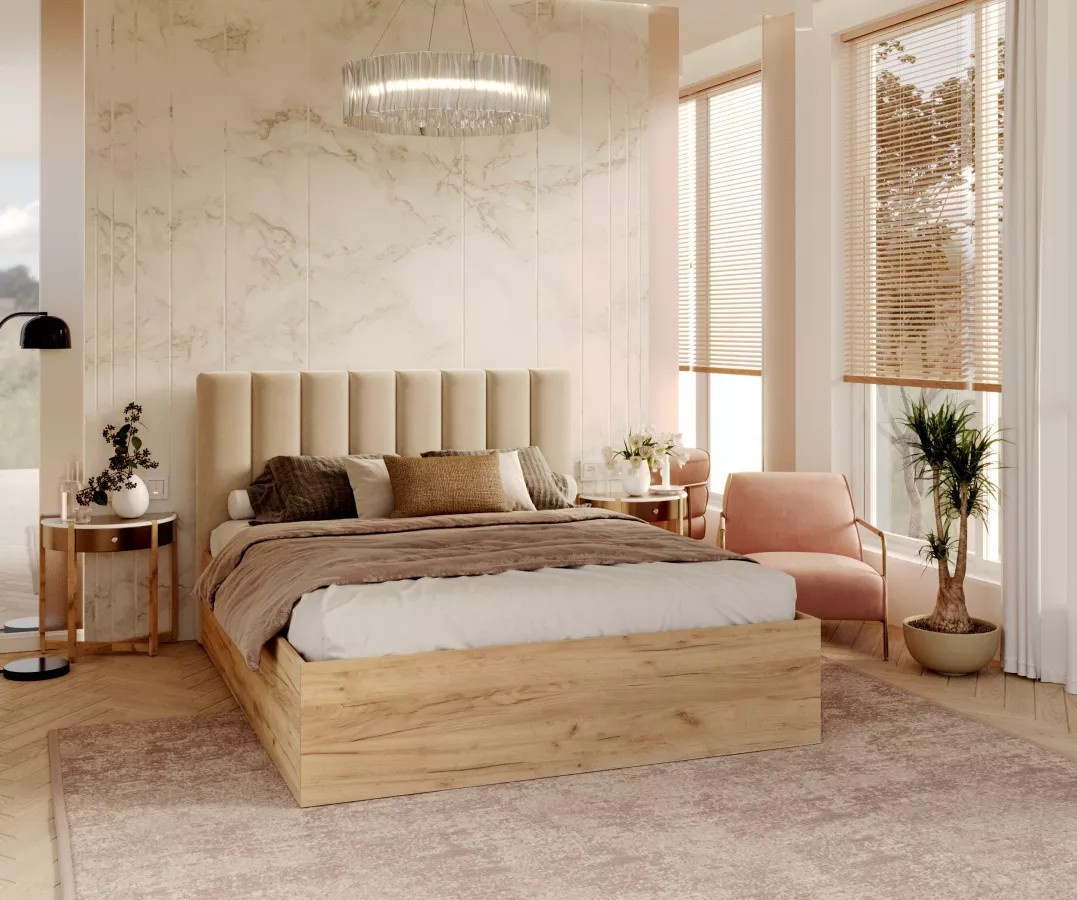 Čalouněná postel GRENADA – spojení stylu, komfortu a funkčnosti Ložnice je srdcem každého domova, místem, kde odpočíváme a regenerujeme síly. Proto je tak důležité, aby byla zařízena nejen stylově, ale především pohodlně. Postel s čalouněným čelem GRENADA je vynikajícím řešením pro ty, kteří si cení spojení elegance, funkčnosti a pohodlí. Jeho klasický design s nádechem modernosti dodá každé ložnici jedinečný charakter a každodenní odpočinek se stane čistým potěšením. Manželská postel GRENADA – komfort a praktičnost v jeden Model GRENADA není jen estetika, ale také praktická řešení. Díky použití zvedacího rámu, postel skrývá prostorný úložný prostor na ložní prádlo, který poskytuje další místo pro ukládání. Hluboký úložný prostor, přiléhající přímo k podlaze, umožňuje ukládání i těžkých předmětů bez obav o jeho odolnost. Postel GRENADA je tedy ideálním spojením pohodlí a funkčnosti – místo na spaní, které zároveň plní roli prostorného nábytku. Solidní konstrukce – kvalita na léta Odolnost a stabilita jsou klíčové vlastnosti modelu GRENADA. Konstrukce postele byla vyrobena z vysoce kvalitní nábytkové desky, odolné proti deformacím a poškození. Šrouby s velkým průměrem a další výztuhy zajišťují pevnost a absence vrzání, i při intenzivním používání. Díky tomu bude postel sloužit po mnoho let a poskytovat pohodlí každou noc. Elegance a komfort – čalouněné čelo postele GRENADA Jedinečný styl postele GRENADA doplňuje čalouněné čelo, potažené vysoce kvalitní sametovou látkou TRINITY. Tento materiál se vyznačuje jemným leskem, sametovou strukturou a výjimečnou odolností proti oděru a žmolkování. To ideální řešení do ložnice, které dodává interiéru eleganci a třídu. Čelo postele nejen okouzluje vzhledem, ale také poskytuje pohodlnou oporu při večerním čtení nebo sledování filmů. Skříňka postele, vyrobená z MDF desky s přirozeným vzhledem dřeva, doplňuje celek a dodává nábytku výjimečný charakter. Kombinace čalouněného čela a úložného prostoru s texturou dřeva se jistě odlišuje od většiny postelí s čalouněním nebo vyrobených zcela z MDF desky. GRENADA – postel vytvořená s ohledem na váš komfort Postel do ložnice GRENADA je ideální volbou pro osoby, které chtějí spojit estetiku s funkčností. Jeho nadčasový design, solidní konstrukce a praktická řešení z něj činí kus nábytku, který splní očekávání i těch nejnáročnějších uživatelů. Pozvěte do své ložnice luxus a pohodlí výběrem modelu GRENADA! CHARAKTERISTIKA POSTELE GRENADA: Konstrukce z vysoce kvalitní nábytkové desky charakterizující se odolností a snadnou údržbou čistoty Čalounění čela postele látkou Trinity - moderní vzhled s dekorativním prošíváním Zvedací kovový rošt - Rošt je podporován zvedacím mechanismem - dva plynové písty. Má březové pružící lamely Prostočelní čelo postele - postel přiléhá celým čelem ke zdi, nezanechává vzadu prázdný prostor Úložný prostor na lůžkoviny - nachází se pod celou postelí. Věci zůstávají skryté Samostatná montáž - doporučujeme sestavovat postel ve dvou osobách Prvky v posteli jsou spojeny pomocí nábytkových excentrických spojů, které se vyznačují spojením, které není vidět z vnější strany nábytku Použité zpevňující spojení zajišťuje, že prvky postele jsou dobře propojené Jednoduchá a rychlá montáž. Ke každé posteli přikládáme montážní sadu a návod.