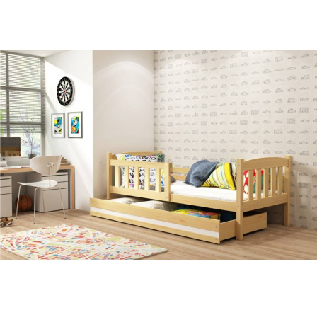 Dětská postel Kuba je určena pro ty, kteří pro své dítě hledají funkčnost, pohodlí a kvalitu. Postel je vyrobena z borovicového dřeva. Na lakování je použitý bezpečný, vodou ředitelný lak vyhovující normám. Její stabilní konstrukce, zaoblené hrany a zábrana, která je v ceně postele, zajišťují bezpečnost dítěte. Zábranu si můžete podle potřeby umístit na pravou, nebo levou stranu postele. Součástí postele je také praktický úložný prostor na kolečkách, rošt a pěnová matrace se snímatelným potahem. Plocha pro spaní je 80x160 cm. Postel je dodávána v demontu a součástí je montážní plánek včetně všech potřebných spojovacích materiálů. Vyobrazené dekorace nejsou v ceně.