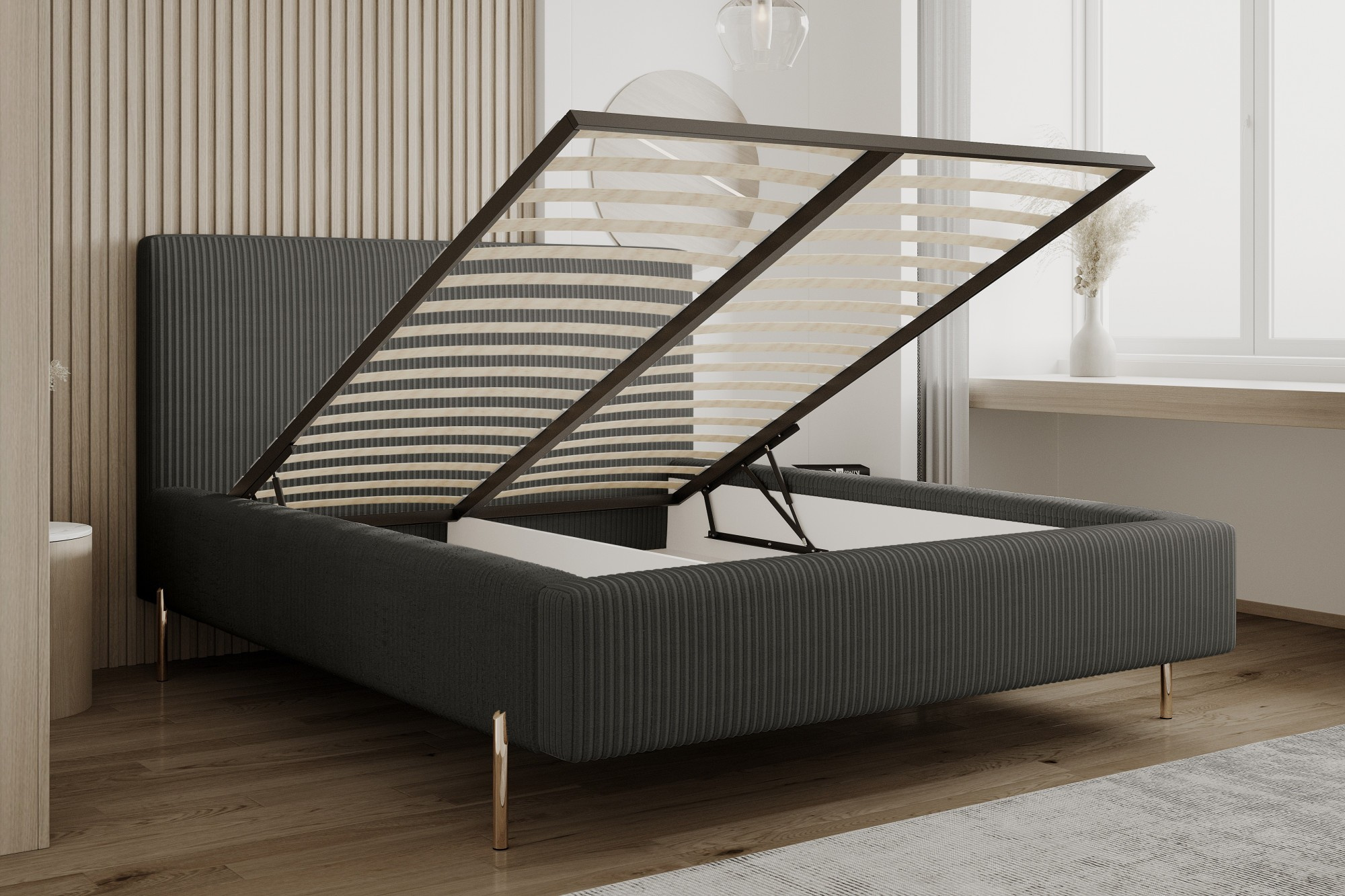 Rám postele: Robustní rám postele zajišťuje stabilitu a nosnost. Je vyroben z kvalitních materiálů, které zaručují dlouhou životnost.