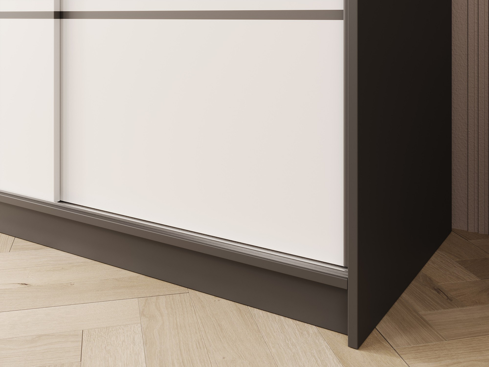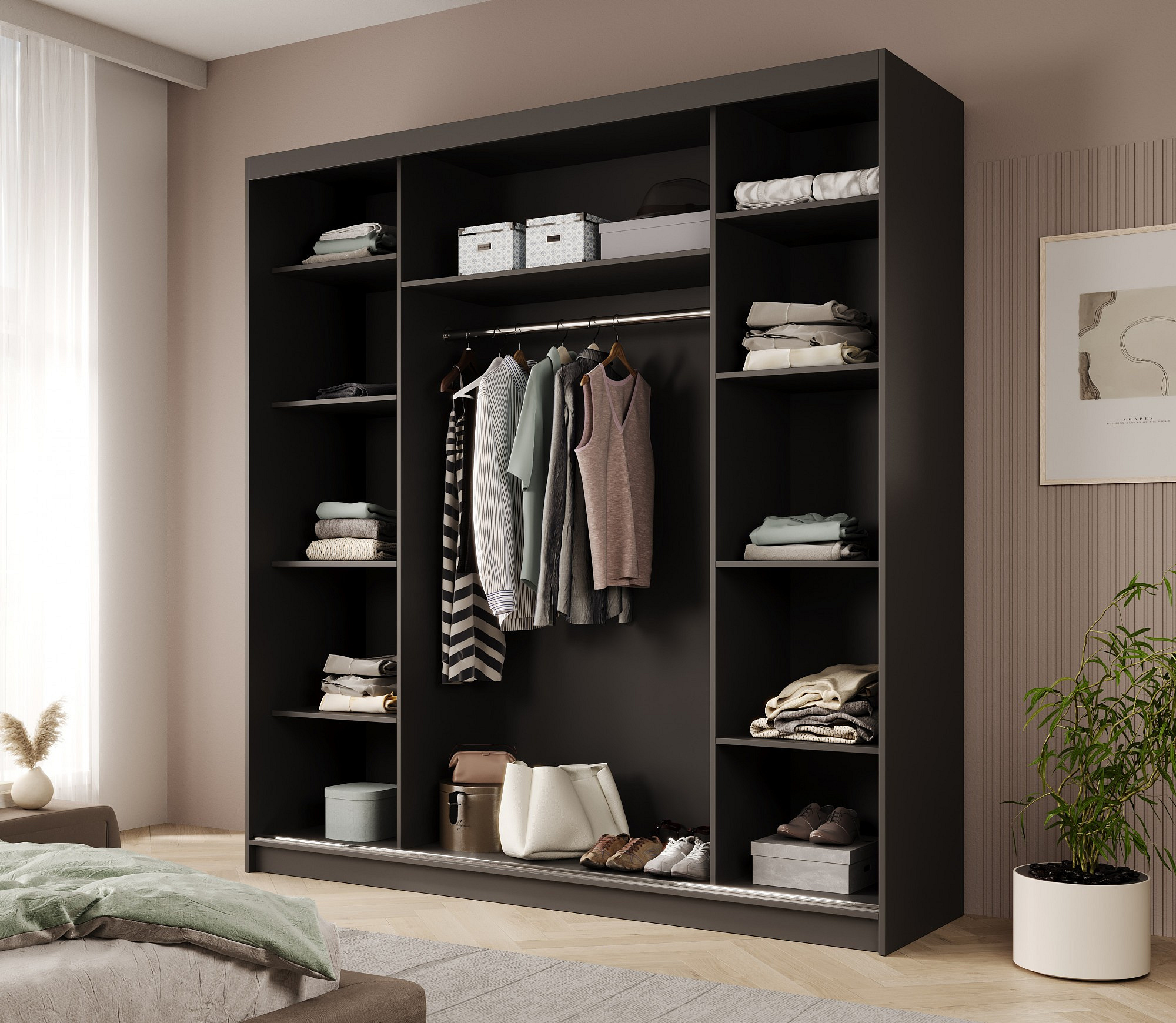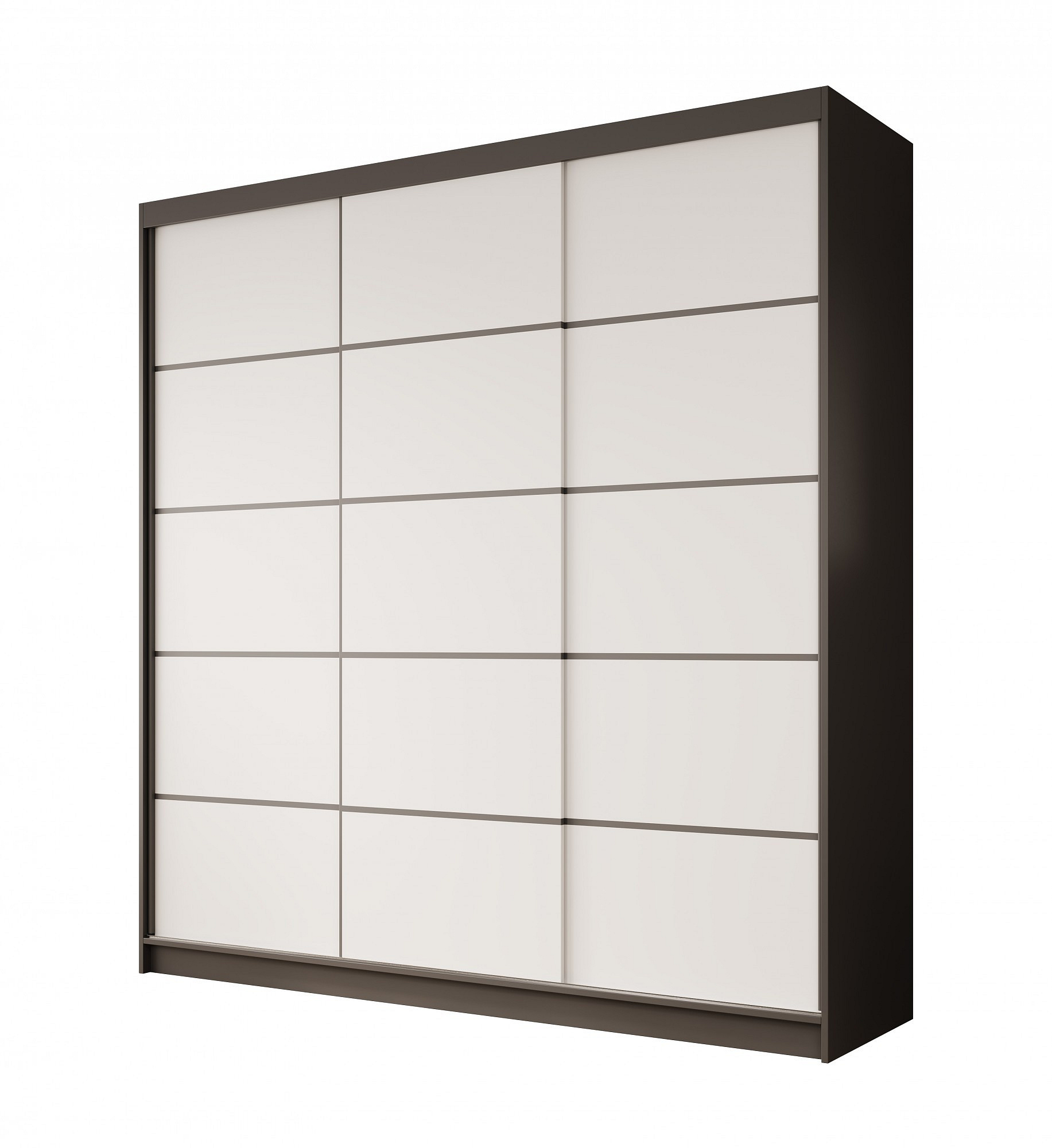 Šatní skříň s posuvnými dveřmi Greta 200 je moderní a funkční řešení, které se skvěle hodí do každé ložnice, šatny nebo předsíně. Její minimalistická forma, geometrické rozdělení čel a pečlivé zpracování dodávají interiéru elegantní a nadčasový charakter. Nábytek je vyroben z vysoce kvalitní laminované desky o tloušťce 16 mm, odolné proti poškrábání, vlhkosti a UV záření, což zaručuje trvanlivost a estetiku po dlouhá léta používání. Skříň je vybavena systémem posuvných dveří, který zajišťuje pohodlné otevírání a zavírání, a zároveň šetří prostor – ideální řešení pro menší místnosti. Vnitřek skříně byl navržen s ohledem na maximální funkčnost – nachází se v ní sada polic a tyčí, díky nimž snadno uspořádáte oblečení, doplňky a další předměty denní potřeby. Model Greta 200 je k dispozici v pěti barevných variantách: klasické bílé, elegantní černé, moderní kombinaci bílá + černá, černá + bílá a v módním odstínu kašmíru.