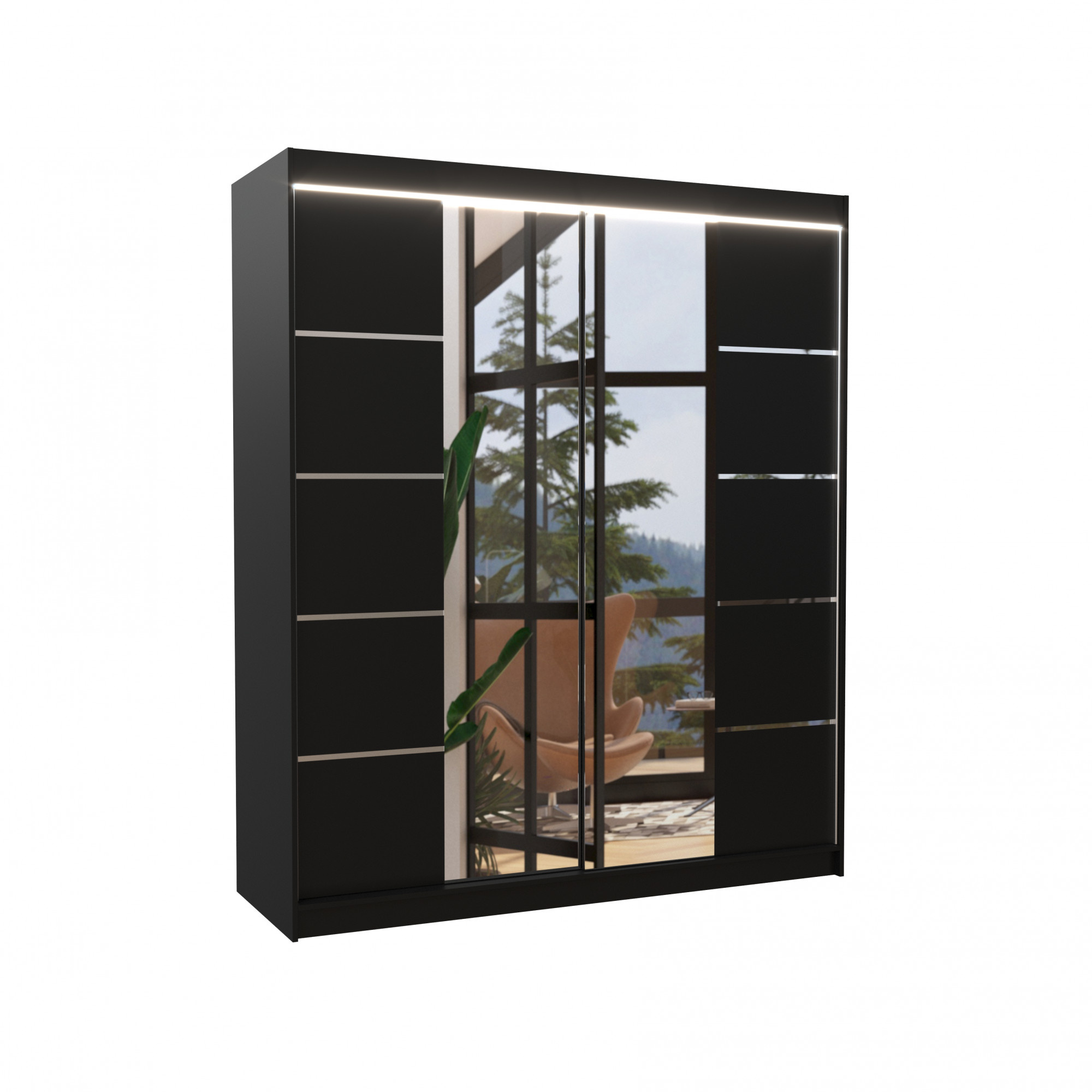 Posuvná skříň se zrcadlem a LED osvětlením TRAVES 180 Černá+Černá