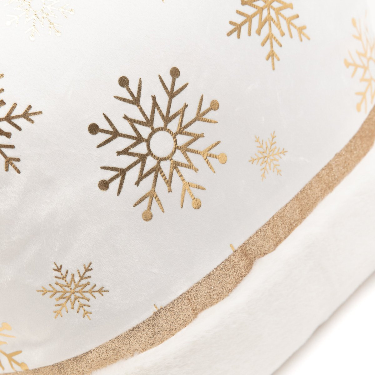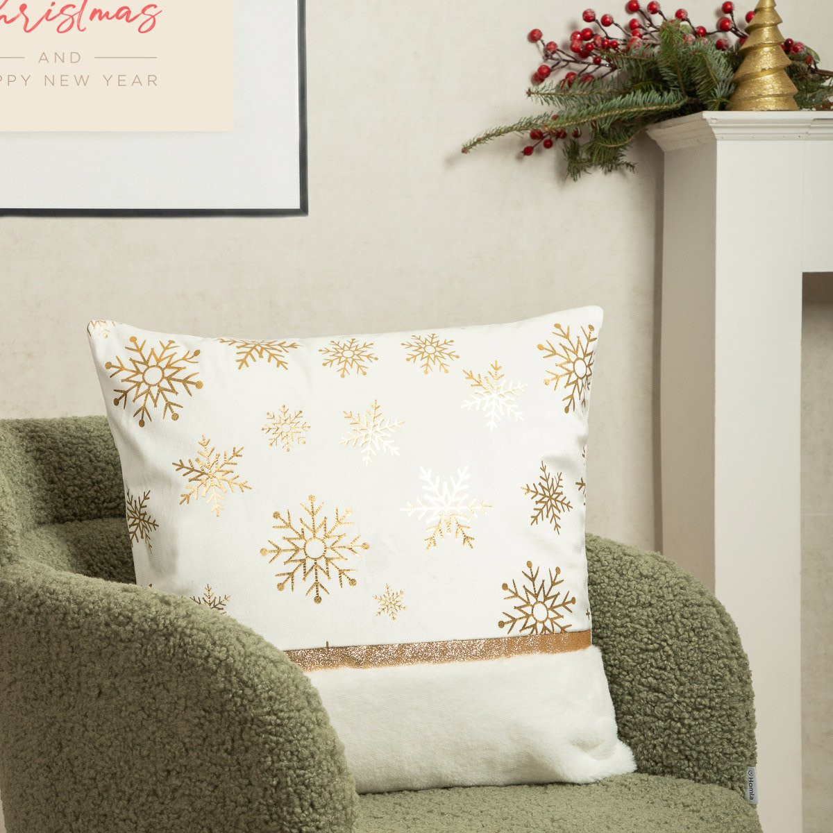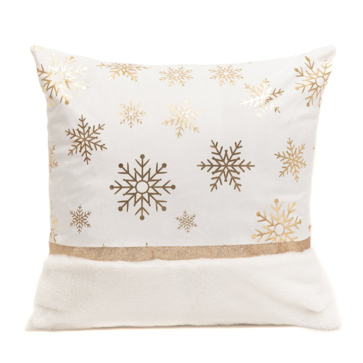 Povlak na polštář Agra byl navržen v minimalistickém stylu. Na světlou látku bylo umístěno několik zlatých sněhových vloček. Kromě toho zlatý pruh ve spodní části odděluje vzorovanou část od spodní části. Barevné schéma činí povlak na polštář mimořádně elegantním.