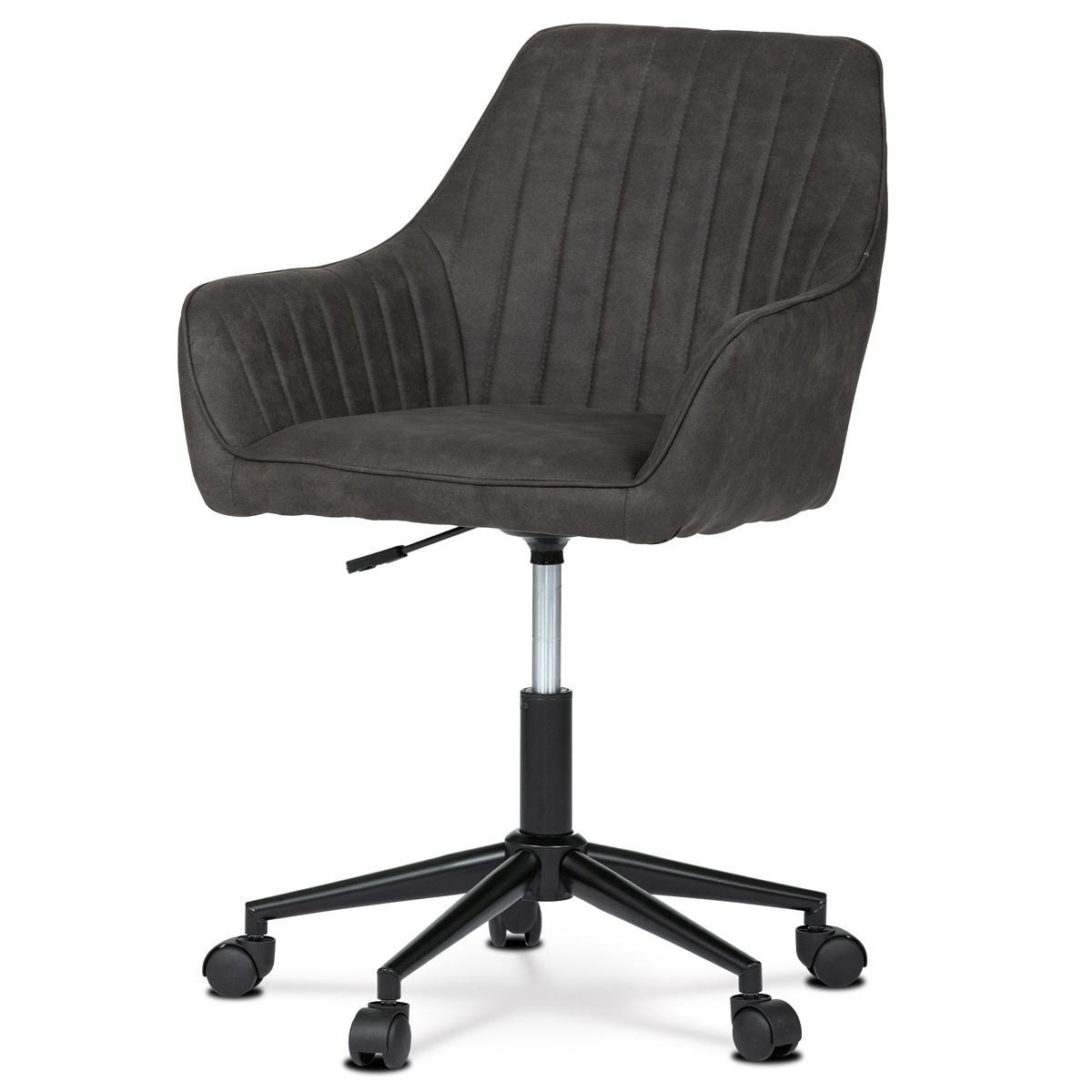 Komfortní pracovní židle k psacímu či pracovnímu stolu v industriálním designu Potah je z látky v černém odstínu v trendy dekoru vintage kůže s dekorativním vertikálním prošitím vnitřních ploch opěráku a zvýšených područek. Výplň je z kvalitní PU pěny, která zaručuje měkké a příjemné dlouhodobé sezení. K tomu přispívá i sedák, který plynule přechází do opěradla. Ke komfortu přispívají i zvýšené područky, o které si můžete pohodlně opřít znavené ruce. Správnou stabilitu zajišťuje pětiramenný kovový kříž s nástřikem černé práškové barvy. Kolečka jsou plastová o průměru 5 cm a určena na koberce. Maximální nosnost je až 110 kg. Židle je výškově nastavitelná v rozmezí 9 cm a otočná o 360°. Výška sezení se upravuje páčkou na pravé straně přes kvalitní plynový píst v barvě kříže. Tato židle se stane skvělou součástí pokoje či pracovny, a to nejen svým líbivým designem, ale také zajímavě působícím vintage potahem v kombinace s decentním prošitím a v neposlední řadě i černým křížem, který celkový vzhled podtrhne. Nejen vzhled, zpracování, variabilita, ale i důraz na pohodlí i ergonomii jsou nedílné součásti. Pracovní činnost s touto židlí je prostě pohoda.