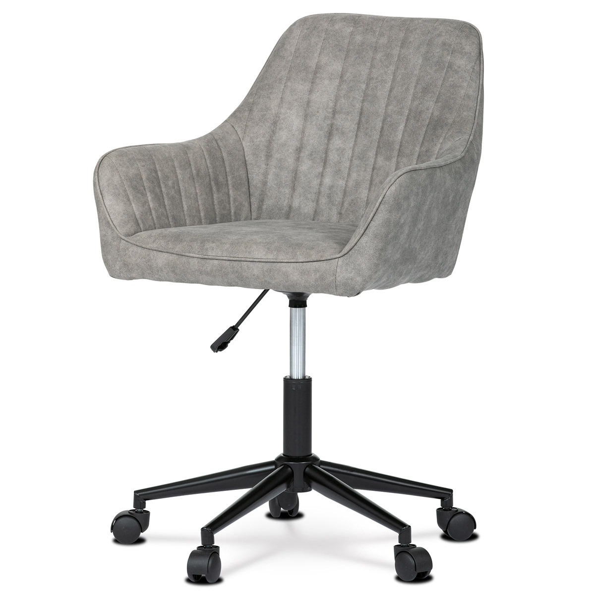 Komfortní pracovní židle k psacímu či pracovnímu stolu v industriálním designu Potah je z látky v šedém odstínu v trendy dekoru vintage kůže s dekorativním vertikálním prošitím vnitřních ploch opěráku a zvýšených područek. Výplň je z kvalitní PU pěny, která zaručuje měkké a příjemné dlouhodobé sezení. K tomu přispívá i sedák, který plynule přechází do opěradla. Ke komfortu přispívají i zvýšené područky, o které si můžete pohodlně opřít znavené ruce. Správnou stabilitu zajišťuje pětiramenný kovový kříž s nástřikem černé práškové barvy. Kolečka jsou plastová o průměru 5 cm a určena na koberce. Maximální nosnost je až 110 kg. Židle je výškově nastavitelná v rozmezí 9 cm a otočná o 360°. Výška sezení se upravuje páčkou na pravé straně přes kvalitní plynový píst v barvě kříže. Tato židle se stane skvělou součástí pokoje či pracovny, a to nejen svým líbivým designem, ale také zajímavě působícím vintage potahem v kombinace s decentním prošitím a v neposlední řadě i černým křížem, který celkový vzhled podtrhne. Nejen vzhled, zpracování, variabilita, ale i důraz na pohodlí i ergonomii jsou nedílné součásti. Pracovní činnost s touto židlí je prostě pohoda.