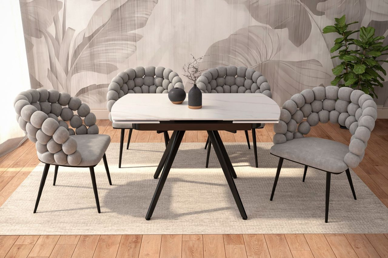 Rozměry: - délka: 120 cm (po rozložení 180 cm) - šířka: 80 cm - výška: 76 cm  Materiál: - deska + vložka: keramika - nohy + rám: kov lakovaný práškovou barvou  Barva: - bílý mramor + černá  Ostatní: - rozkládání: synchronní mechanismus (vysouvání 2 vnějších vložek)